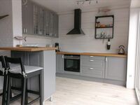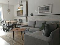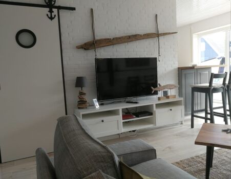 Der ca. 30qm große Wohnraum gliedert sich in einen Wohn-, Essbereich mit offener Küche und Frühstücksbar. Die Küche ist mit Markengeräten (Spülmaschine, Kühlschrank, Herd mit Ceranfeld und Backofen) ausgestattet.