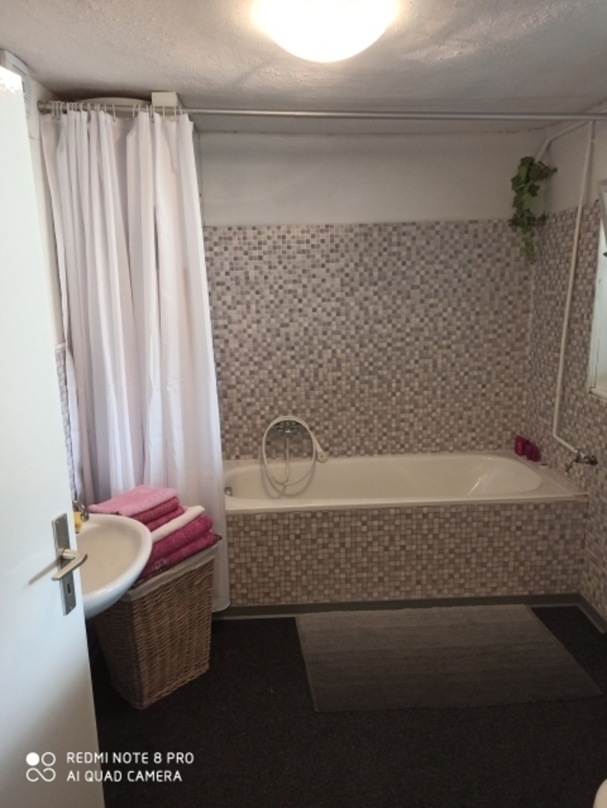 Das Badezimmer verfügt über eine Badewanne mit Dusche.