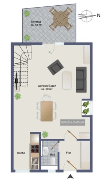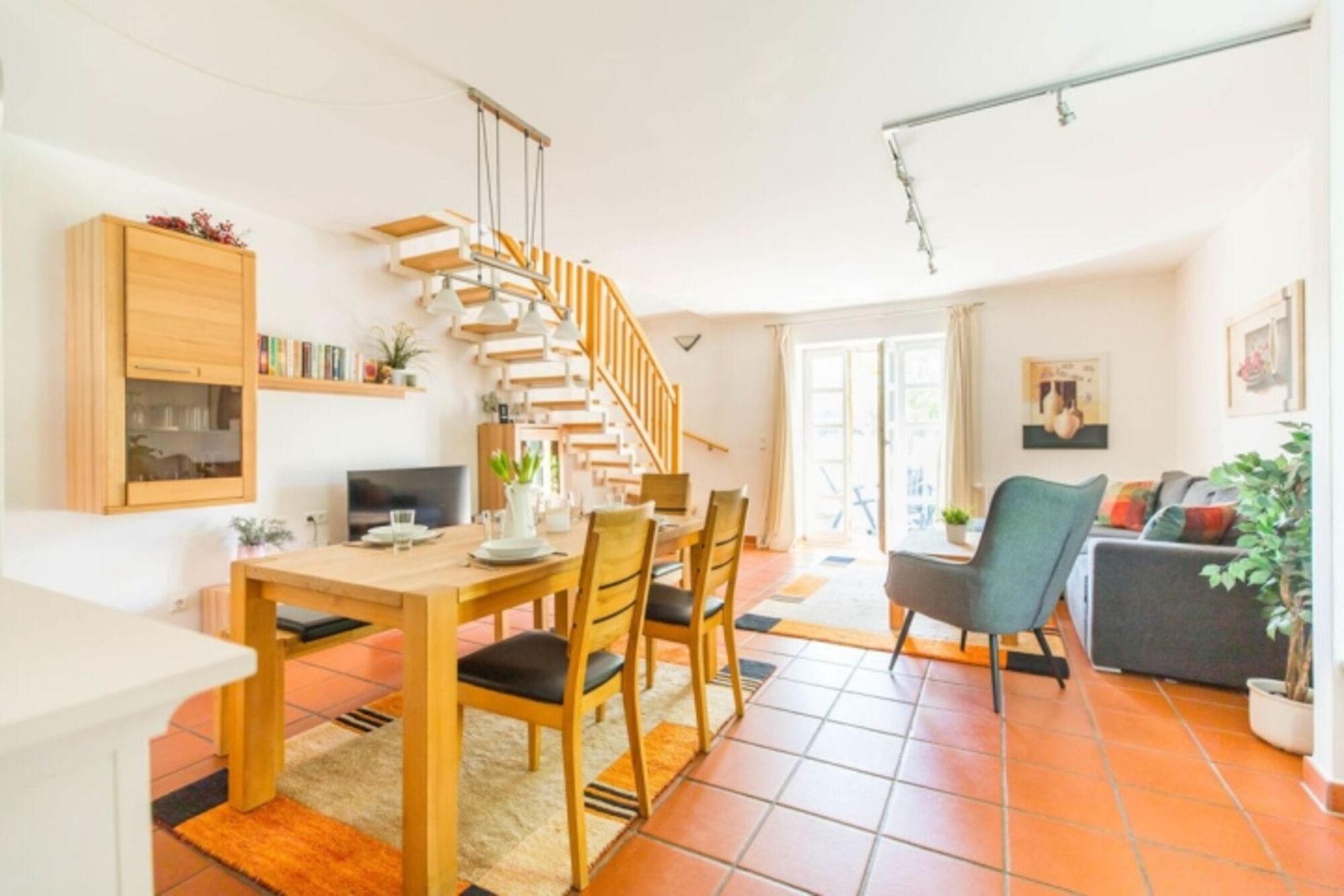 Die Wohnung hat einen separaten Zugang von außen und eine Terrasse zur Sonnenseite mit Gartenmöbeln und Grillkamin.