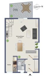 Es handelt sich um eine Maisonette-Wohnung, im Stil eines Reihen-Endhauses. Im Erdgeschoß befinden sich das große Wohn-Esszimmer, die Küche, der Flur mit Garderobenschränken und das Gäste-WC. Im Obergeschoß sind die beiden Schlafzimmer und das Wannenbad.