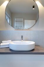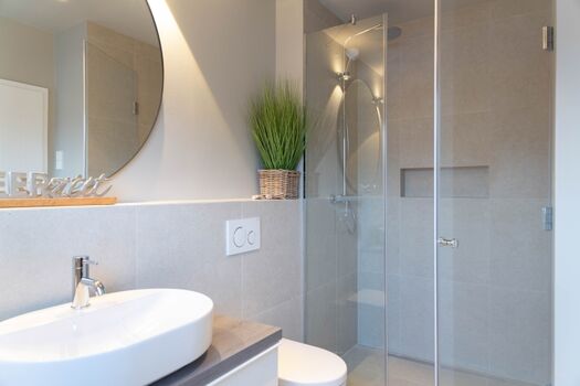 Ein edel gestaltetes Tageslichtbad mit bodentiefer Dusche befindet sich im Erdgeschoss, während sich ein weiteres, elegant gefliestes, Duschbad im ersten Stock des Hauses befindet.