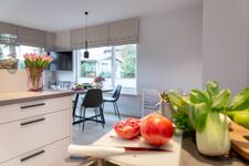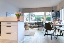Im Erdgeschoss Ihres Domizils befindet sich das Herzstück des Hauses: Ihr gemütlicher und luxuriöser Wohn/und Essbereich. Die offene Küche ist mit stilvollen Ornament-Fliesen gestaltet, die ein zusätzliches Urlaubsgefühl ausstrahlen. Zudem ist die Küche hochwertig mit allem ausgestattet, was Sie für die mühelose Selbstversorgung im Urlaub benötigen. Ihr Essbereich befindet sich direkt am Fenster mit Blick auf die Terrasse und auch die komfortablen Sofaelemente laden Sie ein, gesellige oder verträumte Stunden im Haus zu verbringen. Von hier gelangen Sie auf Ihre große Süd/ Westterrasse, die Sie mit einer immergrünen Hecke blickgeschützt die Sonne genießen lässt. Hierfür stehen Ihnen ein Strandkorb sowie Gartenmöbel zur Verfügung.