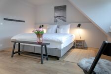 Im Obergeschoss befindet sich ein weiteres, separates Schlafzimmer mit großem Boxspringbett, in dem Sie, Dank der Dachfenster, jederzeit den Himmel über Sylt sehen können.