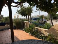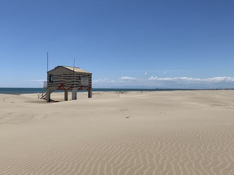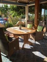 Von der größeren Terrasse und dem Wintergarten hat man einen schönen Blick auf die Salzwiese, die Lagune und auch auf die Pyrenäen.