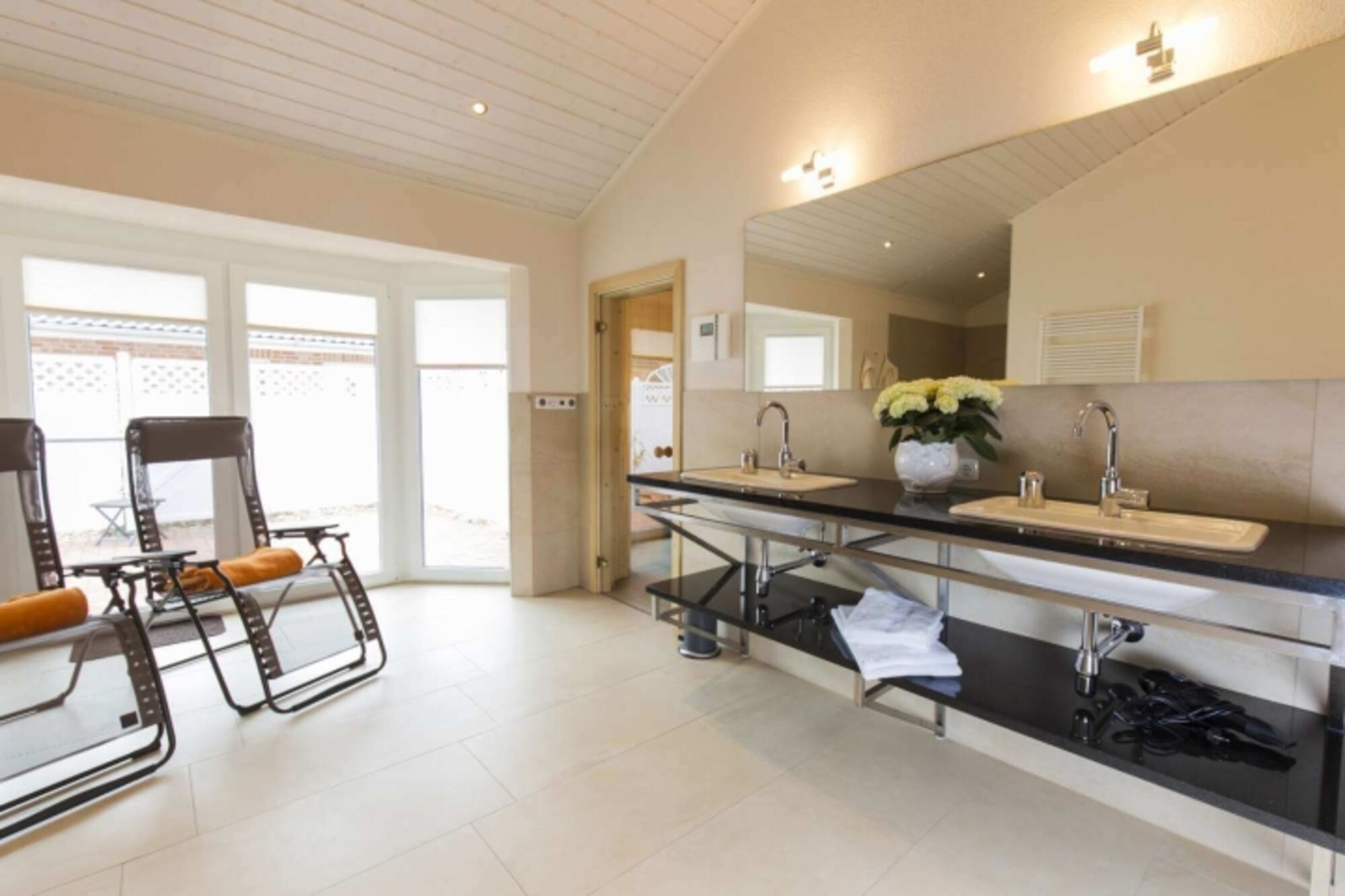 Ein Wellnessbad mit Badewanne, großer ebenerdiger Dusche mit Sitzgelegenheit, Sauna mit verspiegeltem Außenfenster sowie Infrarotwärmestrahler, Wellness-Liegen und beheiztem Außenwhirlpool