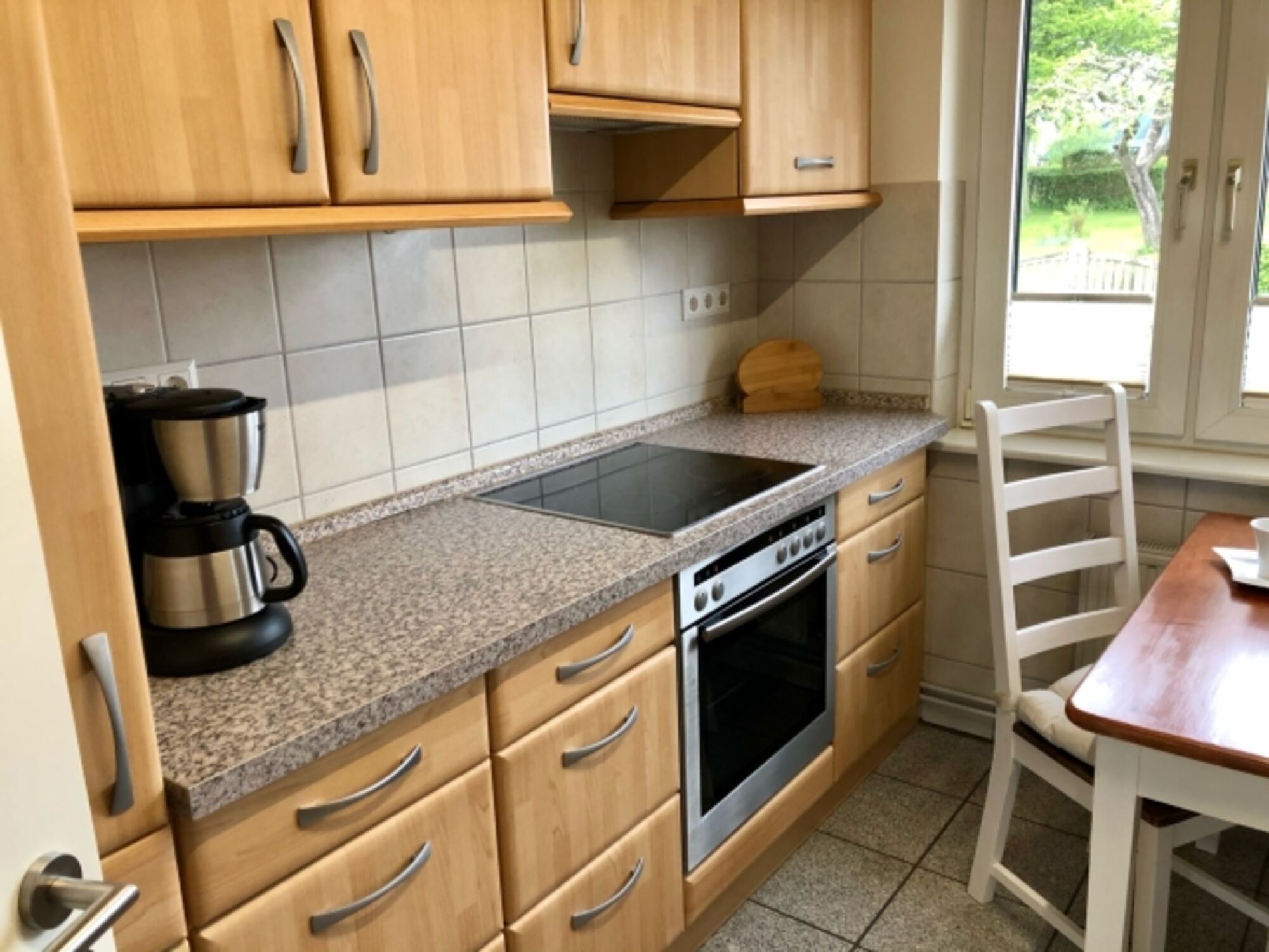 Cerankochfeld, Dunstabzugshaube, Kühlschrank mit Gefrierfach, Gefrierschrank, Küchenmaschine, Korkenzieher / Flaschenöffner, Geschirrhandtücher, Mülltüten, Essplatz in der Küche