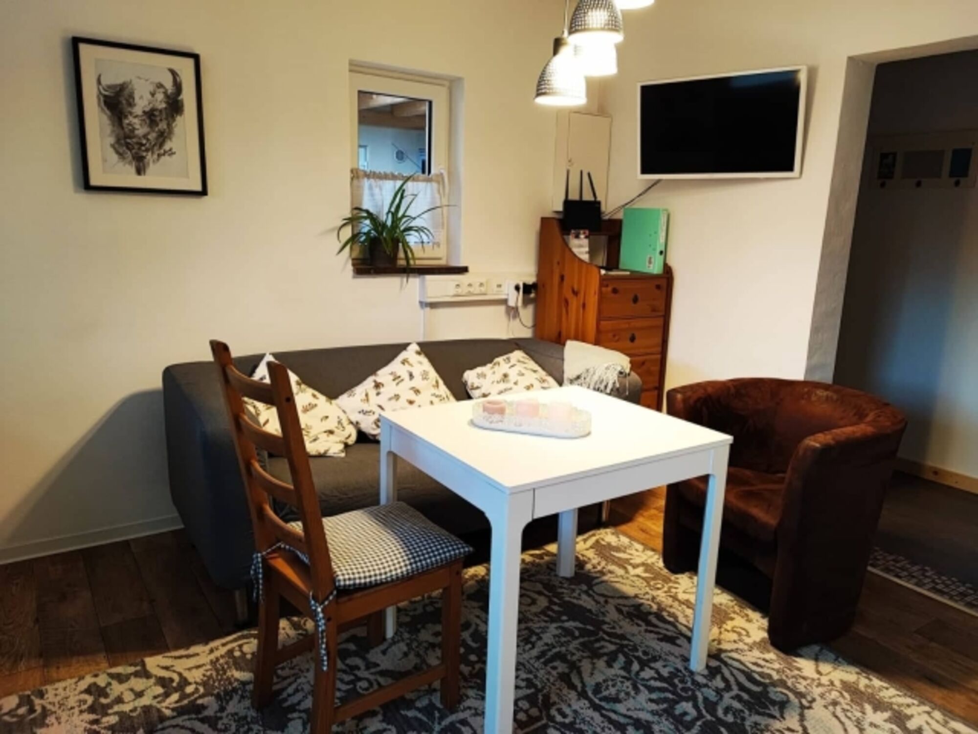 TV, SMART-TV, TV-Flachbildschirm, HDTV Flachbildschirm, Bücher, 3er-Sofa, Sessel, Fliegengitter