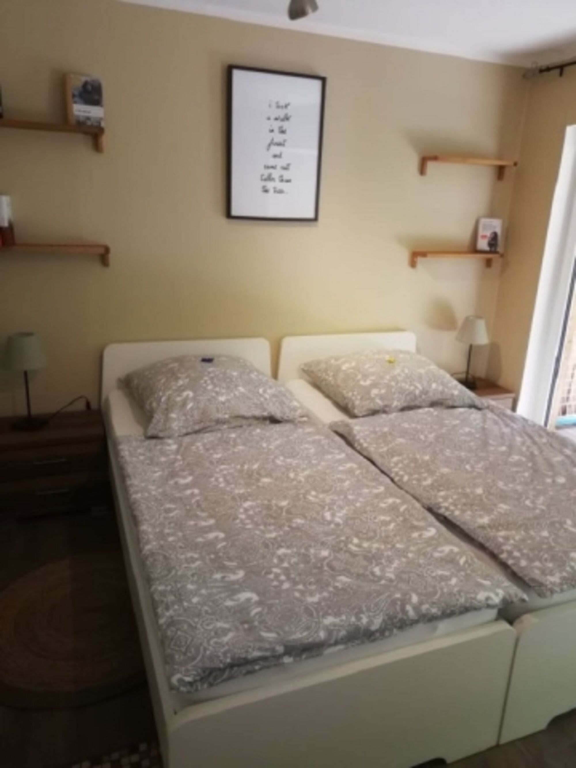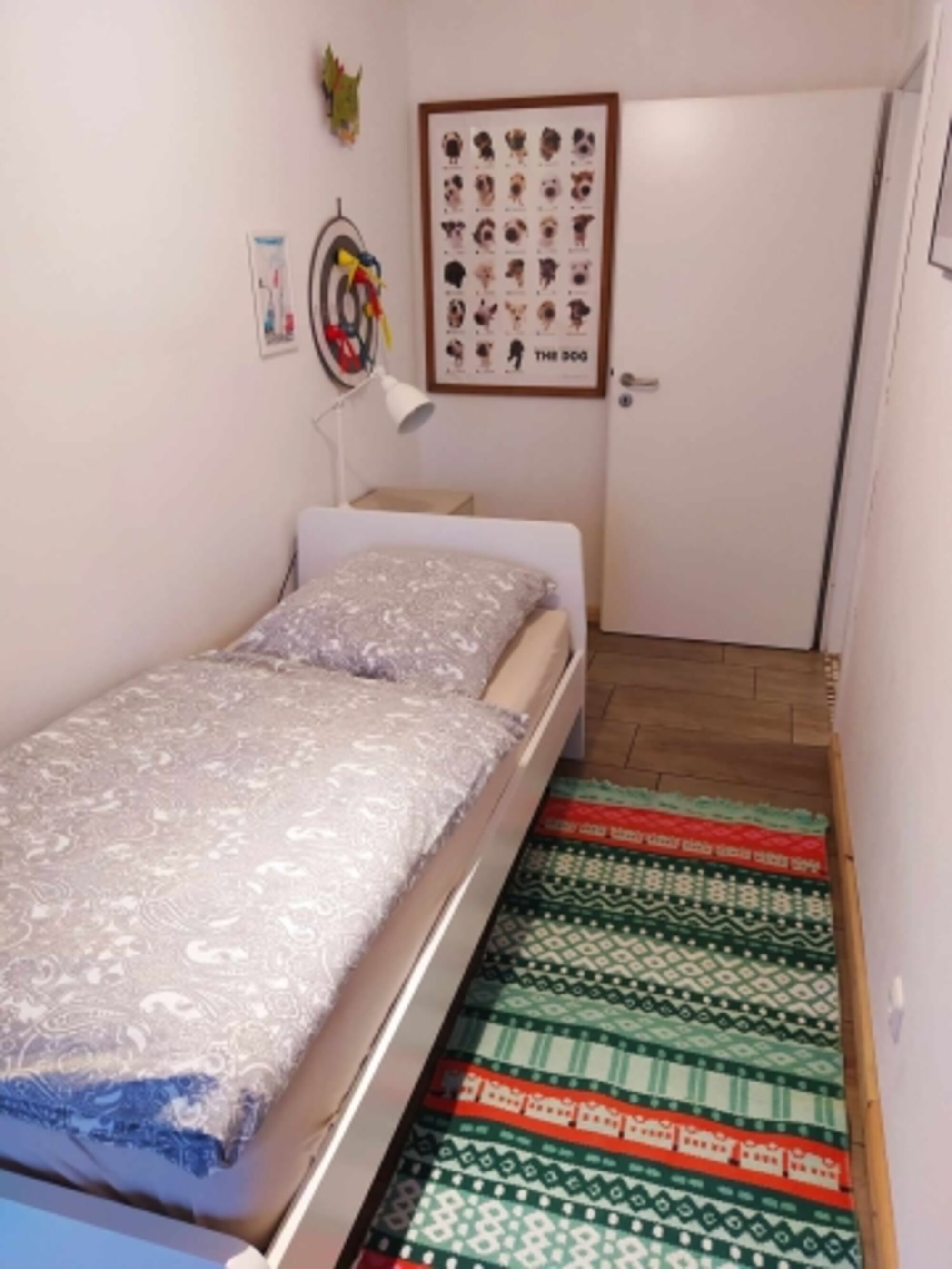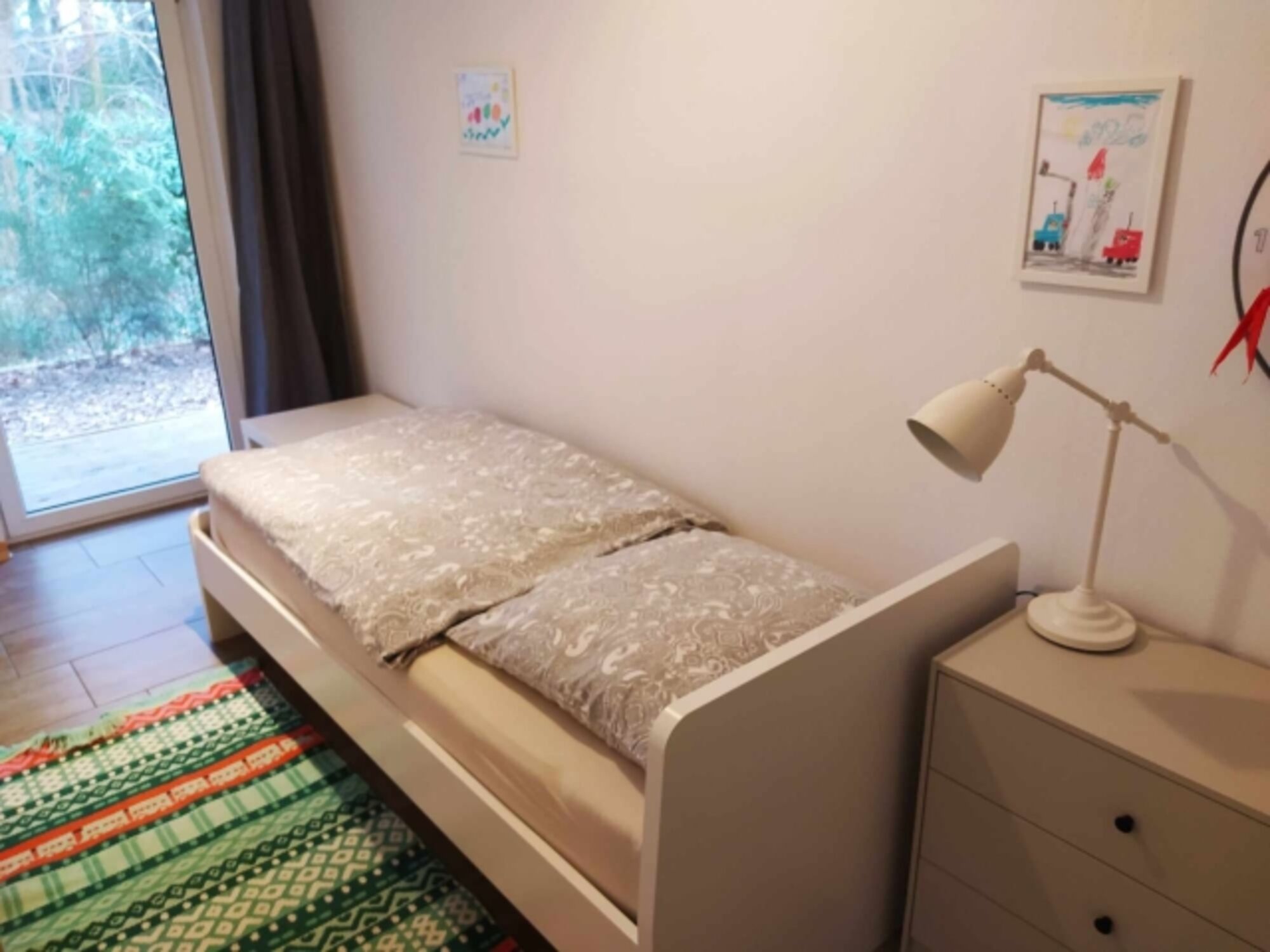Einzelbett, Kommode, Leselampe am Bett, Fliegengitter