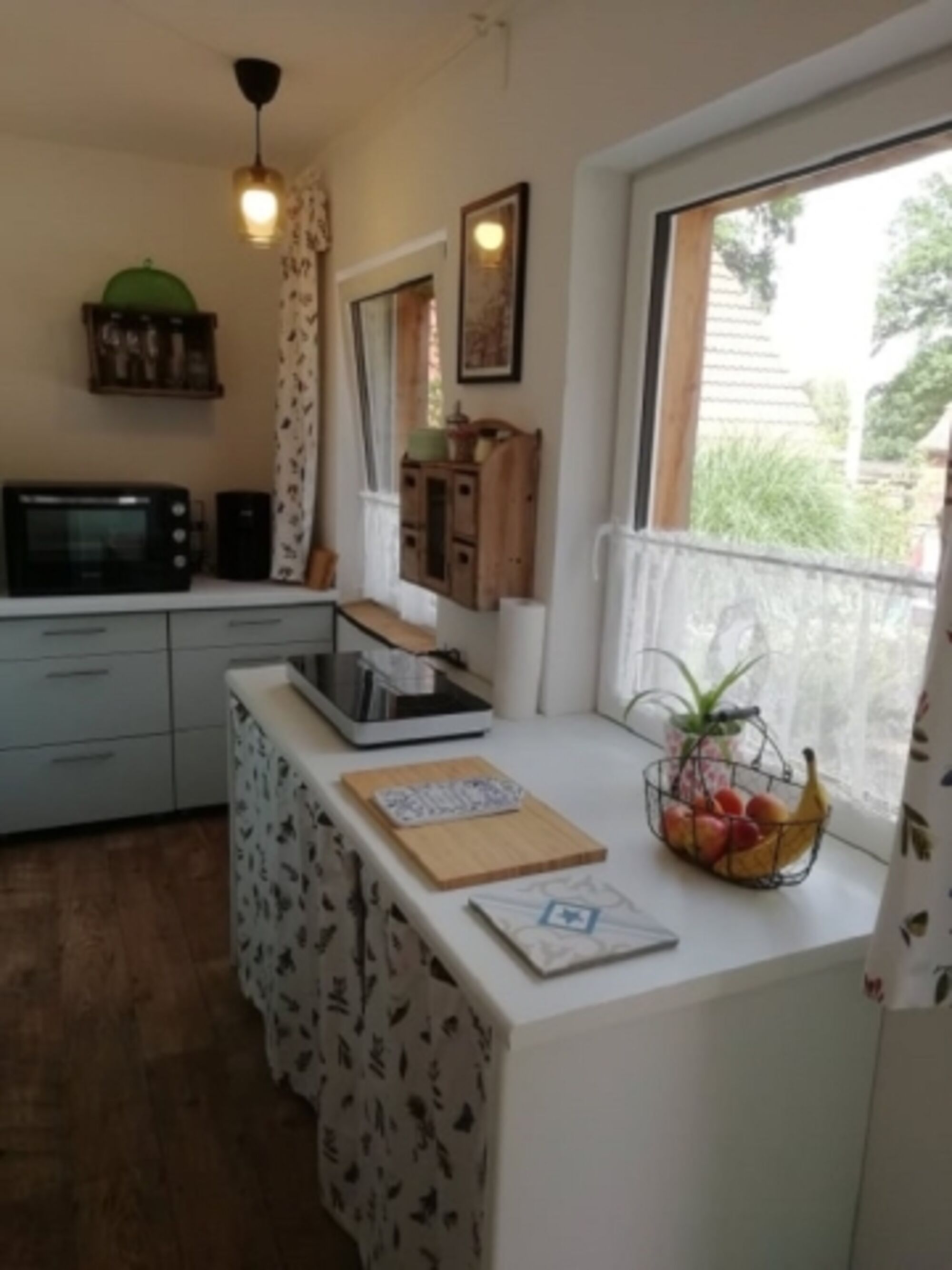 2-Platten Herd, Induktionsherd, Kühlschrank mit Gefrierfach, Gefrierschrank, Eierkocher, Korkenzieher / Flaschenöffner, Gewürze (Salz, Pfeffer, Zucker), Öl / Essig, Geschirrhandtücher, Mülltüten, Essplatz in der Küche, TV in der Küche