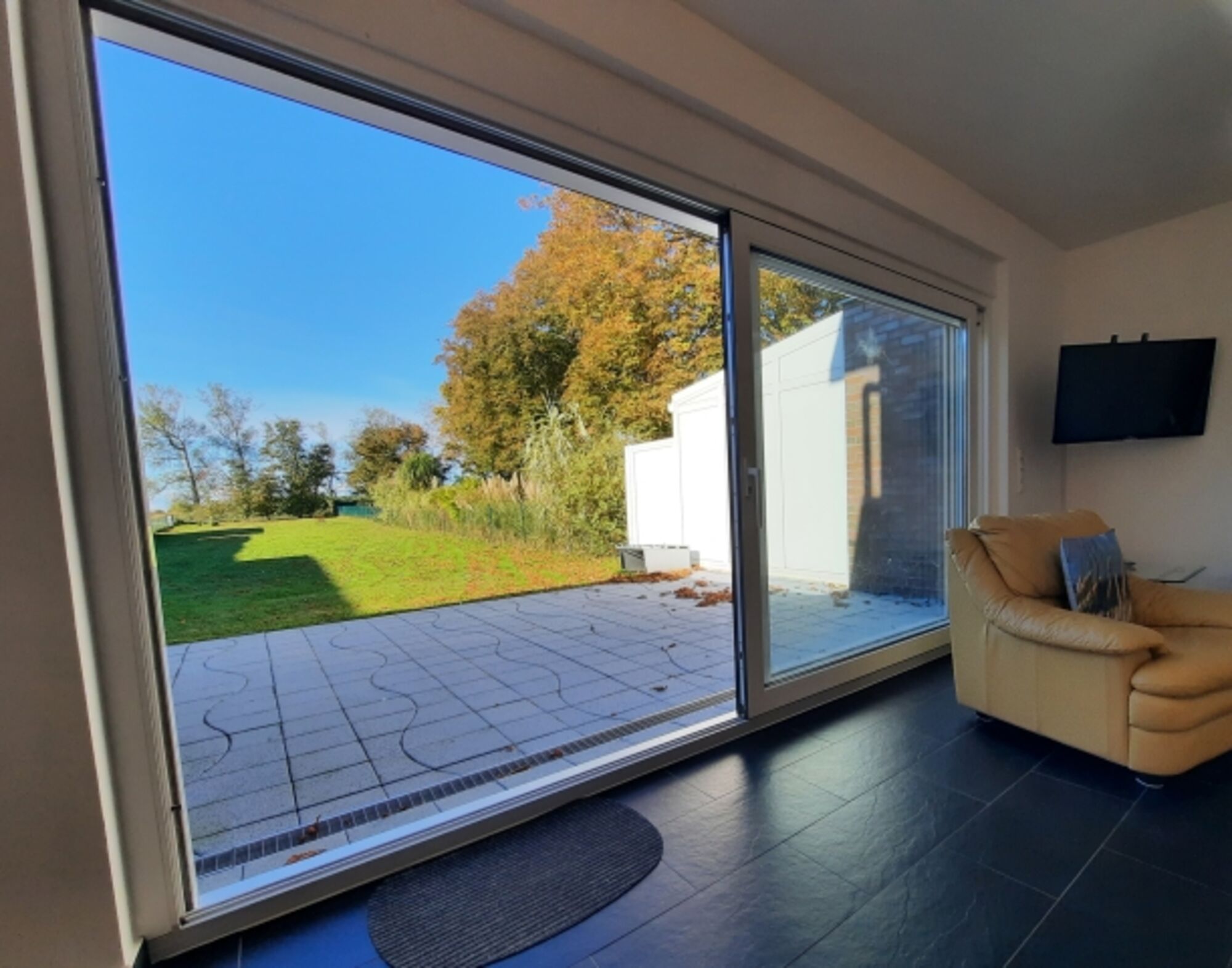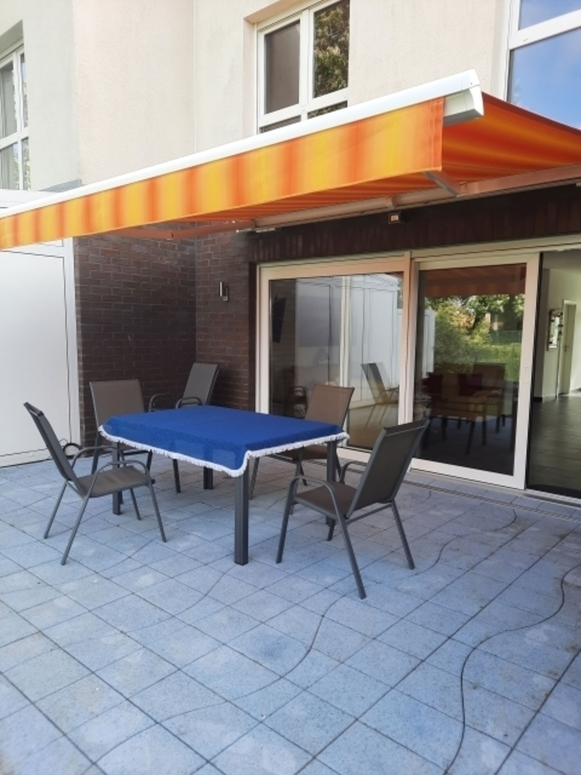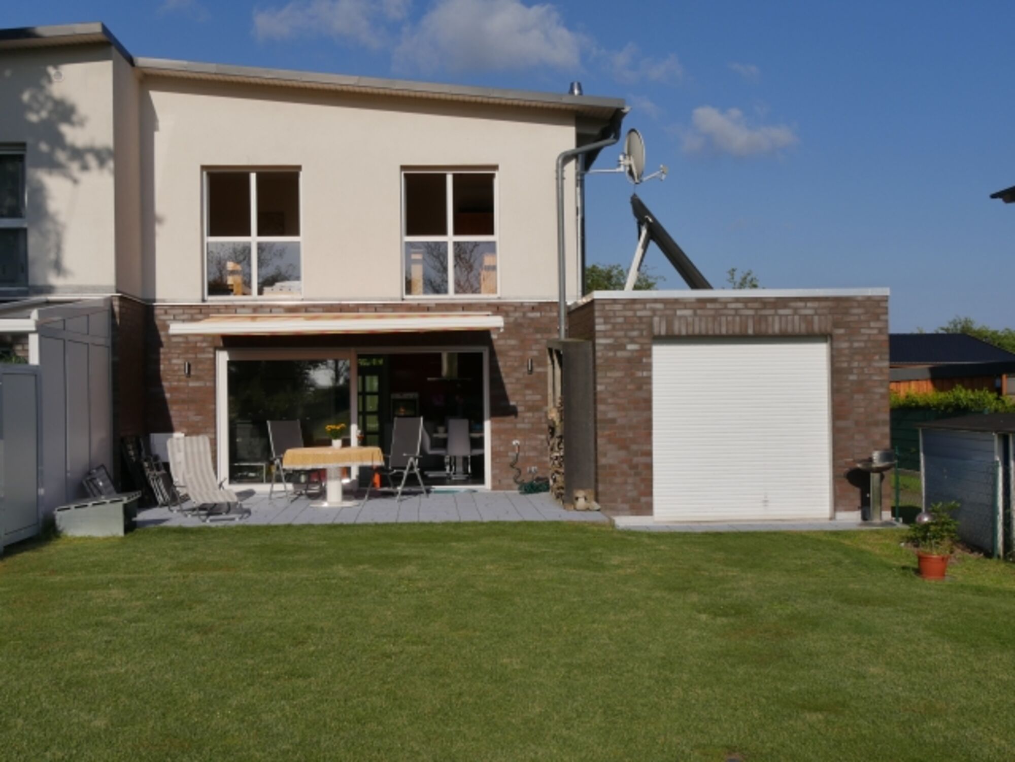 West- und Ostterrasse, dadurch Windschatten bei jeder Windrichtung. Markise bzw. Sonnenschirm. Gartenmöbel. Frühstück in der Morgensonne.