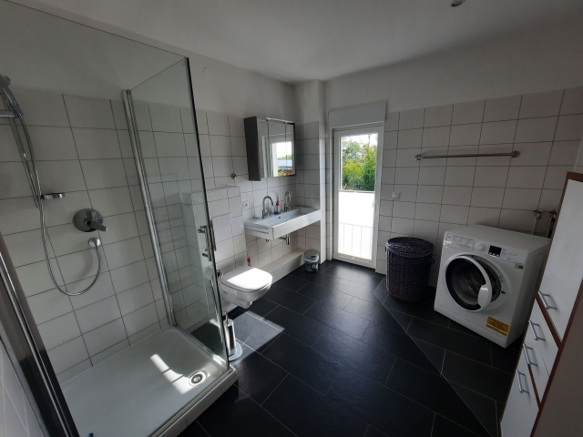 Komplett eingerichtete Küche. Waschmaschine im Bad.