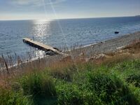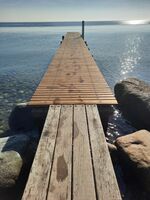 Am Naturstrand springen Sie von dem langen Badesteg ins erfrischende Wasser.