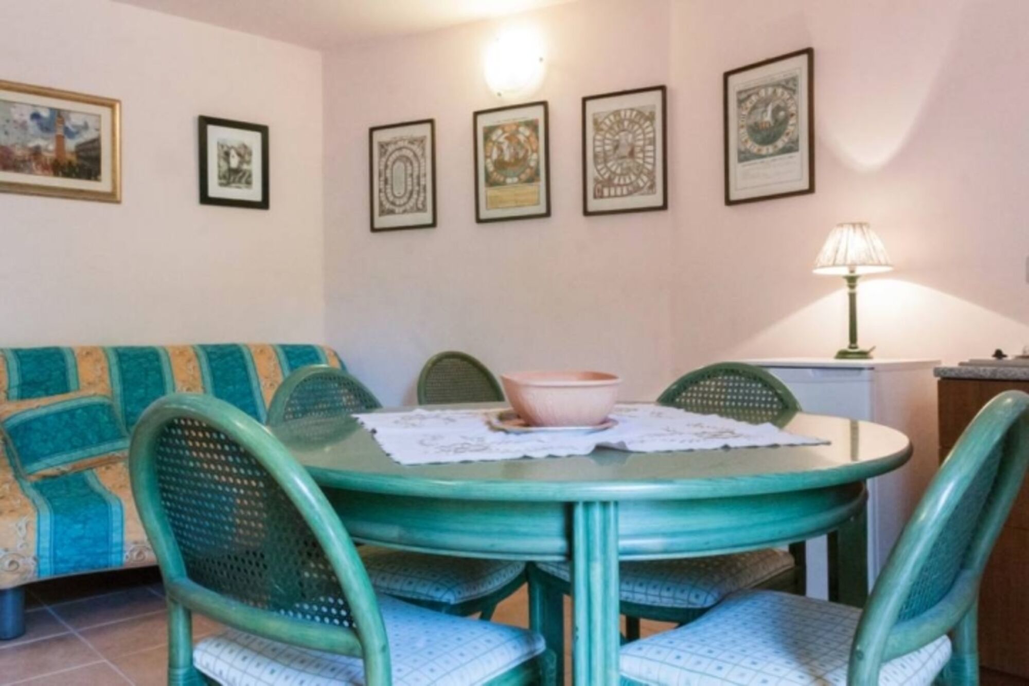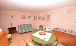 Der Eingang der Dependance führt in einen einfach eingerichteten Wohnraum mit einer kleinen Kochecke mit Tisch und Stühlen. Ein Doppelbettsofa welches bei Gebrauch für die 7. und 8. Person ausgezogen werden kann. Sie haben ein