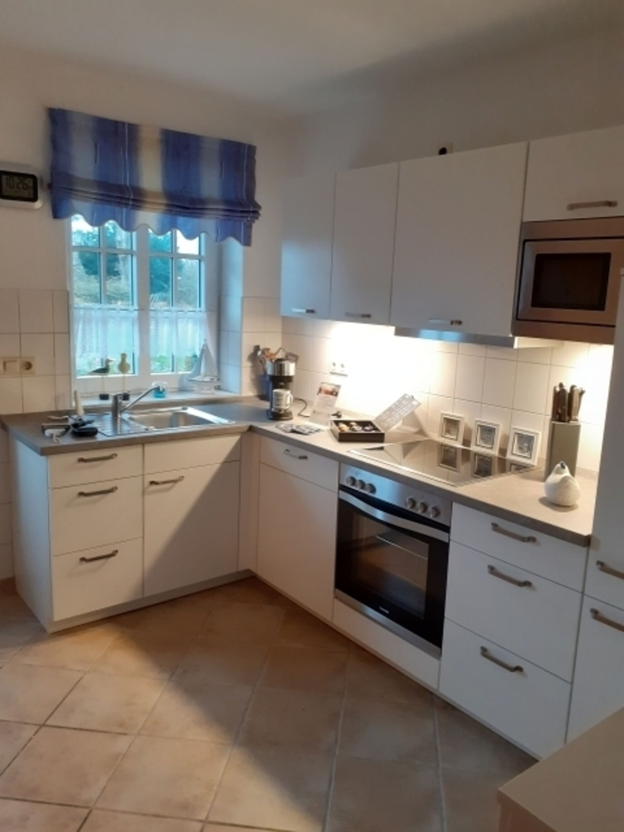 Cerankochfeld, Dunstabzugshaube, Kühlschrank mit Gefrierfach, Nespresso-Automat, Eierkocher, Korkenzieher / Flaschenöffner, Gewürze (Salz, Pfeffer, Zucker), Geschirrhandtücher, Mülltüten