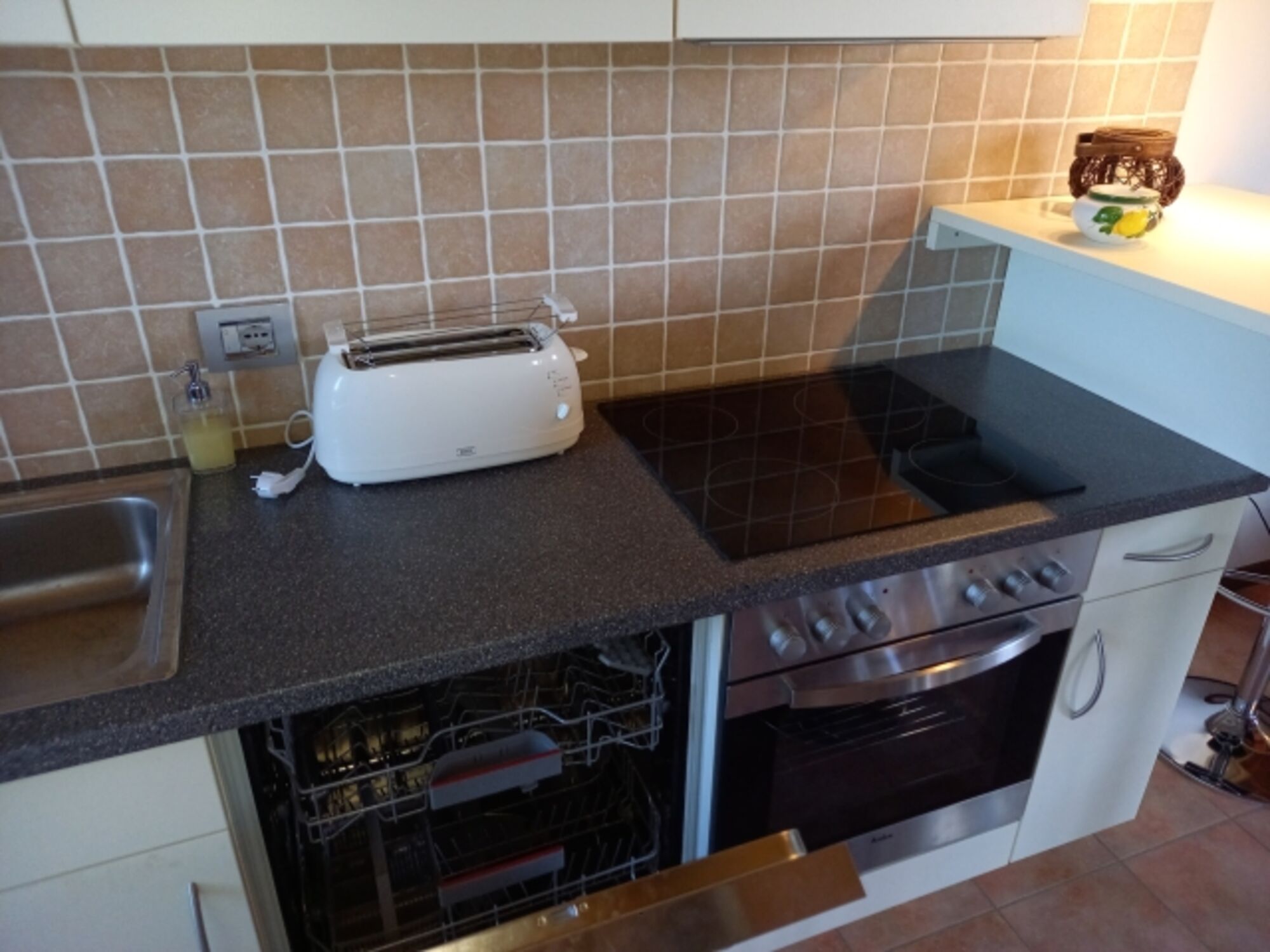 Cerankochfeld, Dunstabzugshaube, Kühlschrank mit Gefrierfach, Eierkocher, Mülltüten