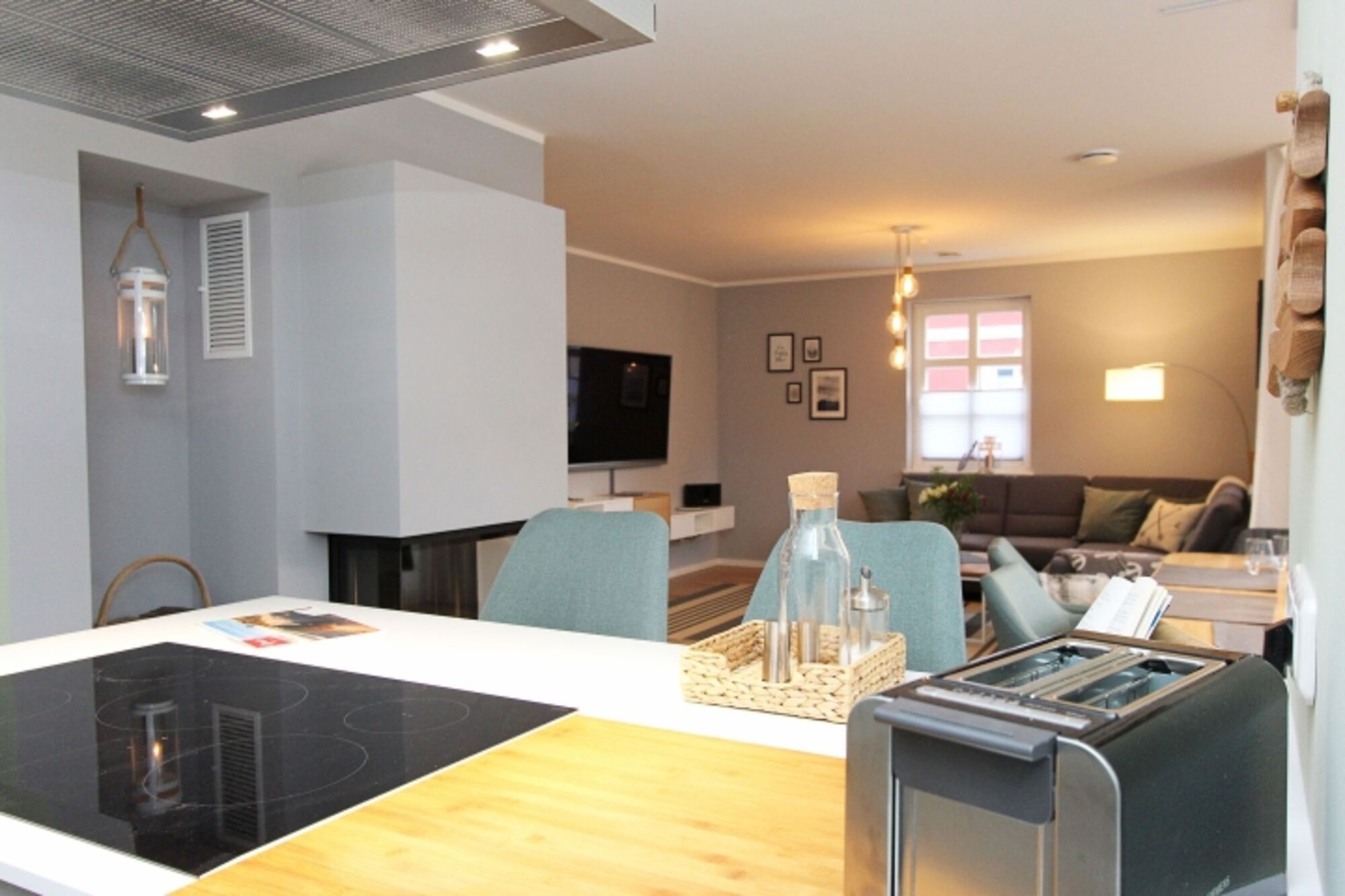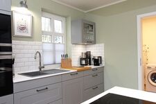 Induktionsherd, Dunstabzugshaube, Gefrierschrank, Korkenzieher / Flaschenöffner, Geschirrhandtücher, Mülltüten, Essplatz in der Küche