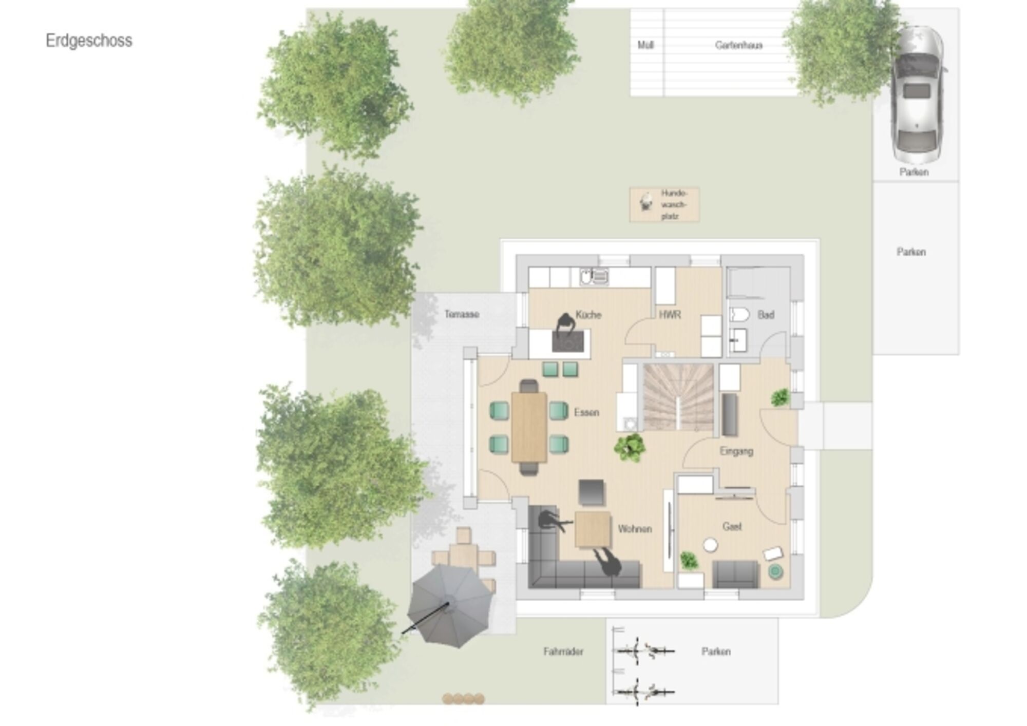 Im Außenbereich stehen Ihnen ein kleiner schön angelegter Garten, eine große Sonnenterrasse und 3 PKW-Stellplätze zur Verfügung.