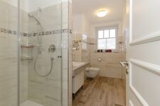 Das sehr geräumige Bad hat eine bodengleiche Dusche.