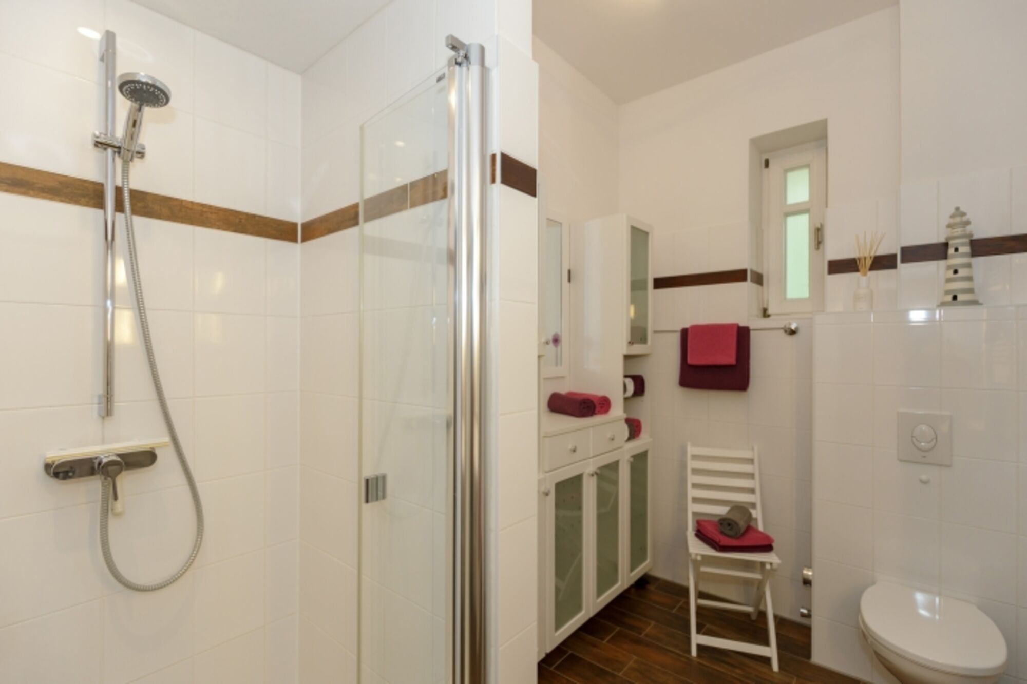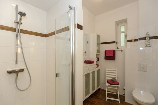 Das geräumige elegante Bad hat eine große bodengleiche Dusche und