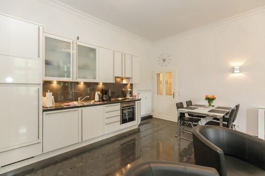 Cerankochfeld, Dunstabzugshaube, Kühlschrank mit Gefrierfach, Senseo-Kaffeeautomat, Korkenzieher / Flaschenöffner, Gewürze (Salz, Pfeffer, Zucker), Geschirrhandtücher, Mülltüten