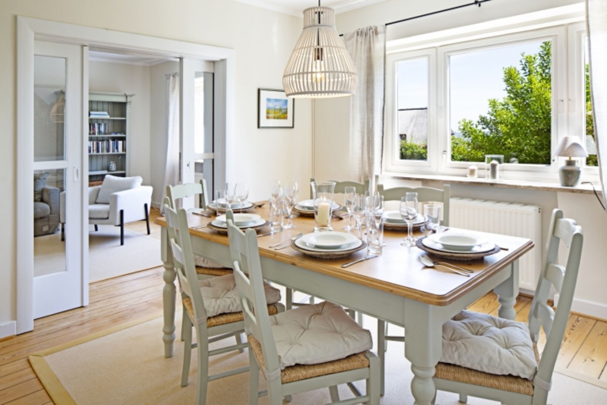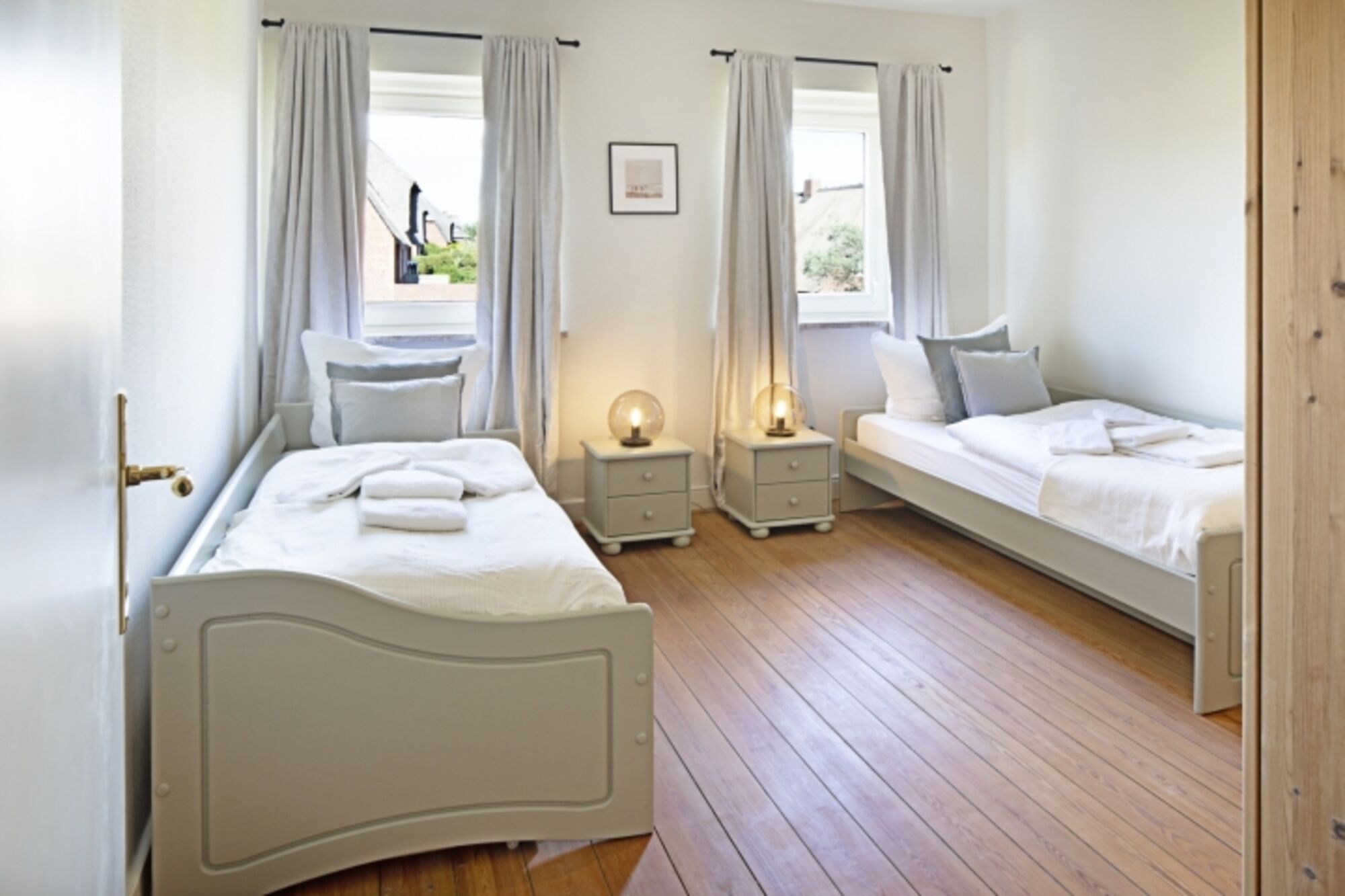 Das Feriendoppelhaus (160 m²) für bis zu 6 Personen verfügt über ein hell eingerichtetes Wohnzimmer, eine große geschlossene Küche, ein separates Schlafzimmer mit Doppelbett und zwei Schlafzimmer mit Einzelbetten. Alle Schlafräume befinden sich in der 1. Etage.