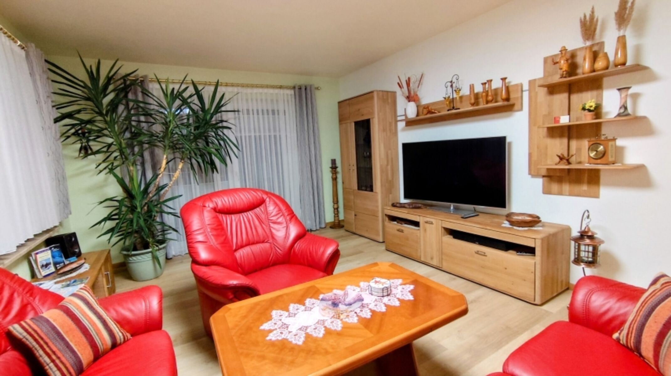 Im Wohnzimmer befindet sich neben den Massivholzmöbeln mit integrierter Ambiente Beleuchtung und einer neuwertigen großen und bequemen Ledersitzecke auch ein 55 Zoll TV mit Satellitenempfang und Internetanschluss.