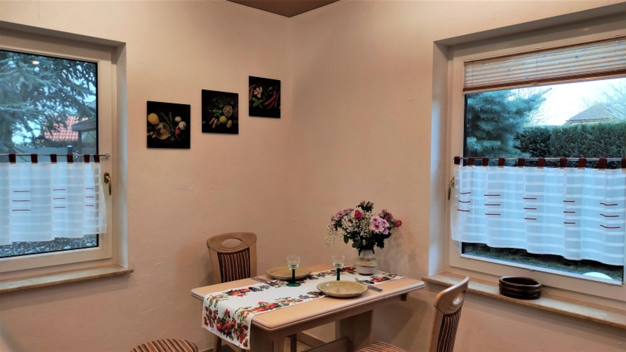 Die Fenster in der Ferienwohnung sind mit Plisseeanlagen und teilweise Insektenschutzgittern ausgestattet.