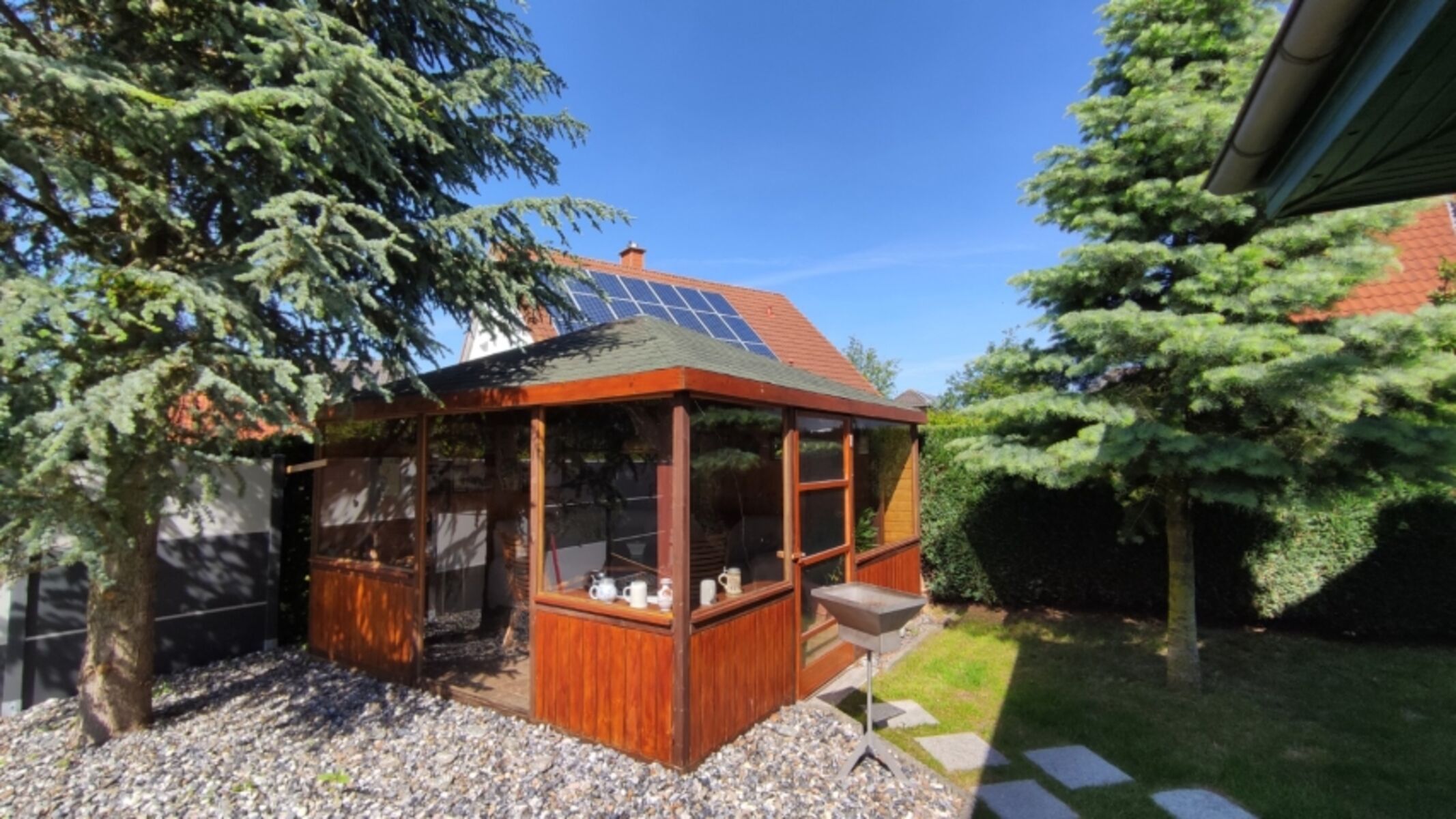 Ein toller Platz um den Abend bei einer guten Flasche Wein ausklingen zu lassen ist dagegen der zur Ferienwohnung gehörende Pavillon. Ein Grill steht hier ebenfalls zur Verfügung.