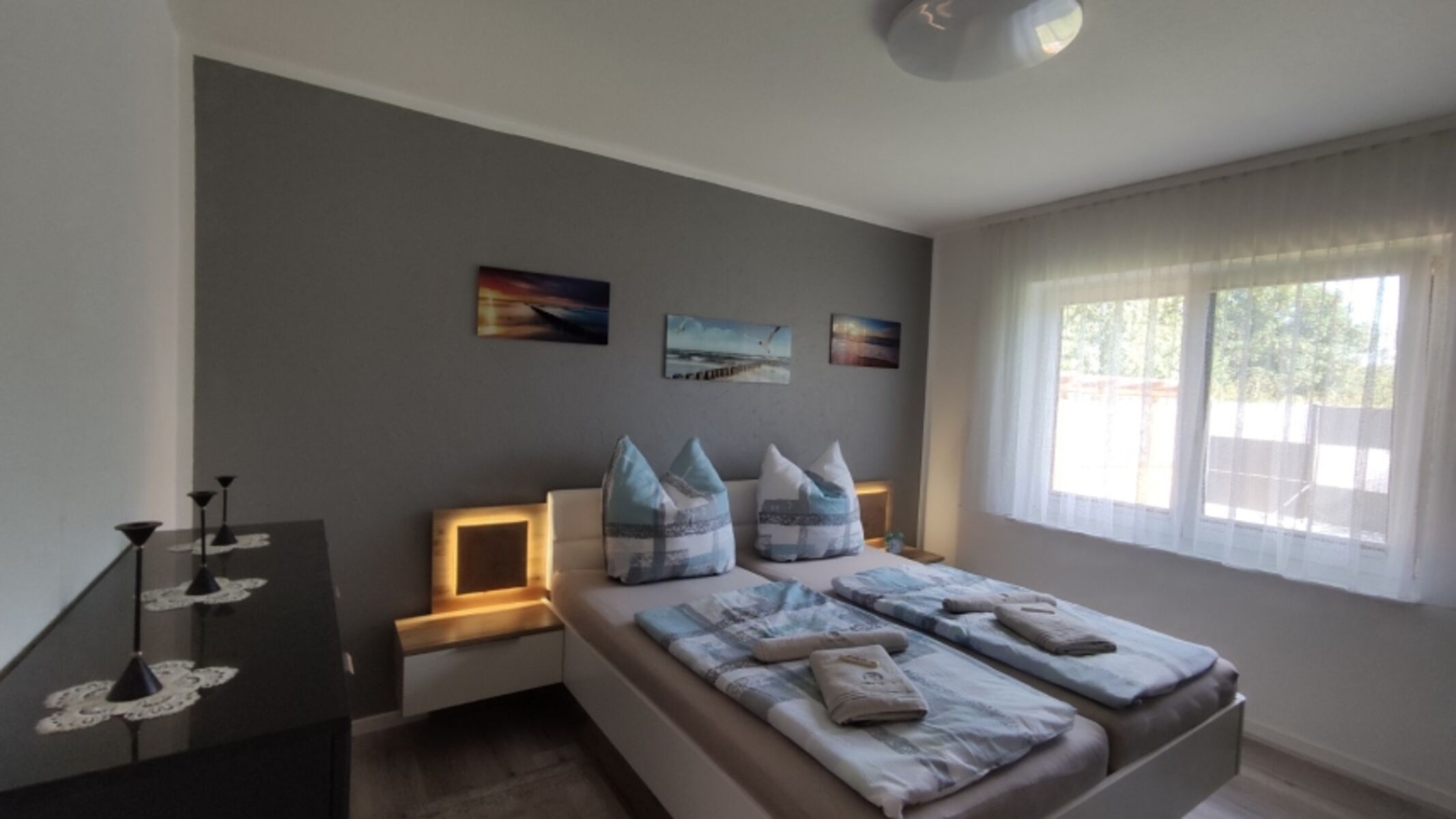 Doppelbett 1,80 x 2,00m, Kommode, Spiegel, Leselampe am Bett, Fliegengitter