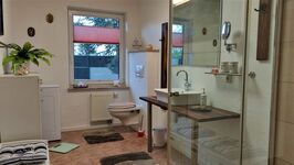 Das geräumige Bad ist mit WC, einer Sitzbank, einer Wäschetruhe sowie einer großen ebenerdigen XXL Dusche, kostenloser Waschmaschine, Föhn, einer Waage, Kosmetiktüchern und einem Schminkspiegel ausgestattet.