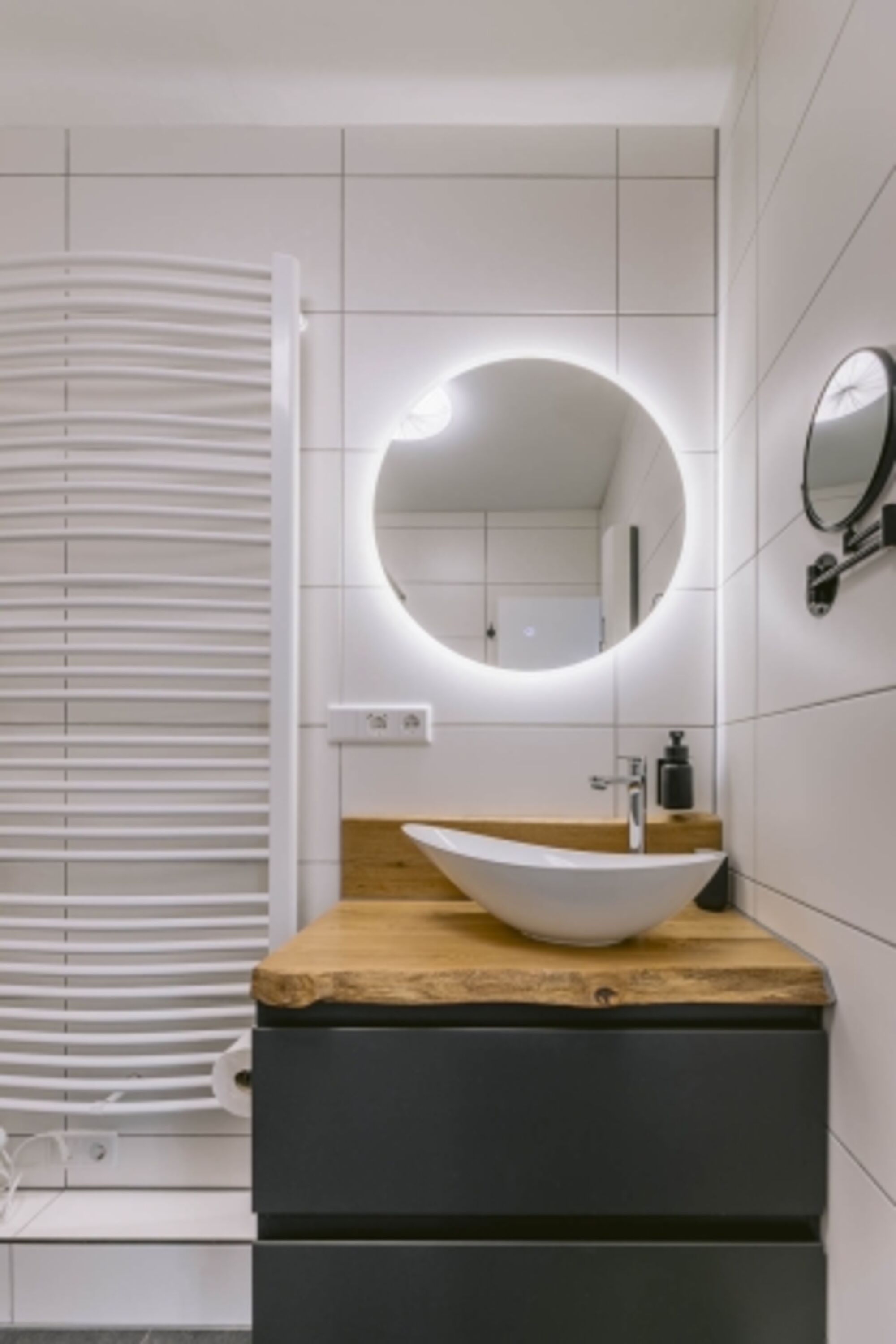 Ein Badezimmer in Fliesendesign mit Dusche, beleuchteten Spiegel, Waschbecken und reichlich Stauraum sorgen dafür, dass das Badezimmer alle Wünsche erfüllt.