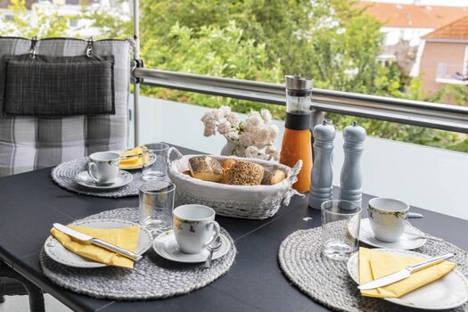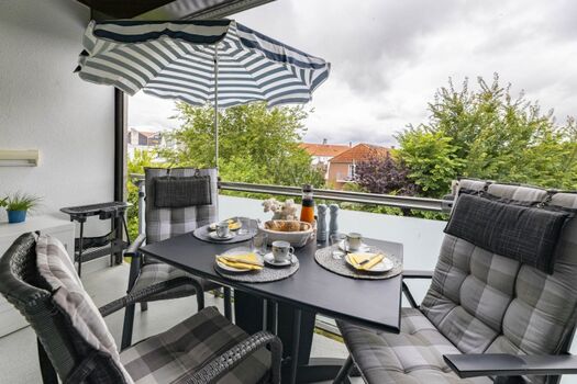 Der nach Süden ausgerichtete Balkon der Unterkunft ist nicht nur besonders sonnig, sondern durch seine komplette Überdachung auch bei schlechteren Wetterverhältnissen gut nutzbar. Balkonmöbel laden zum Verweilen ein.