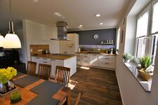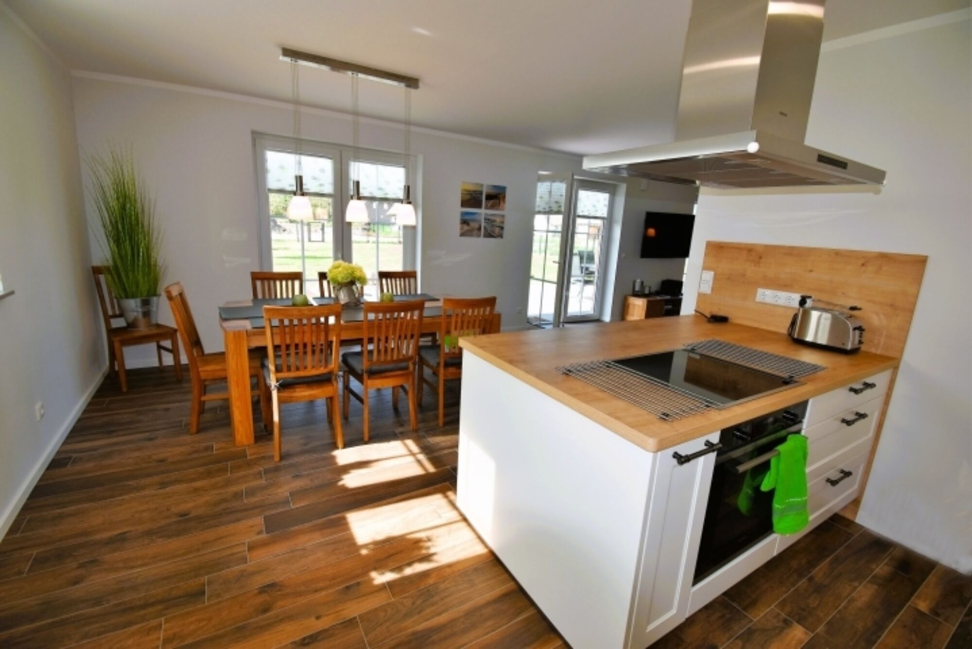 Induktionsherd, Dunstabzugshaube, Gefrierschrank, Senseo-Kaffeeautomat, Eierkocher, Mixer, Korkenzieher / Flaschenöffner, Geschirrhandtücher, Essplatz in der Küche