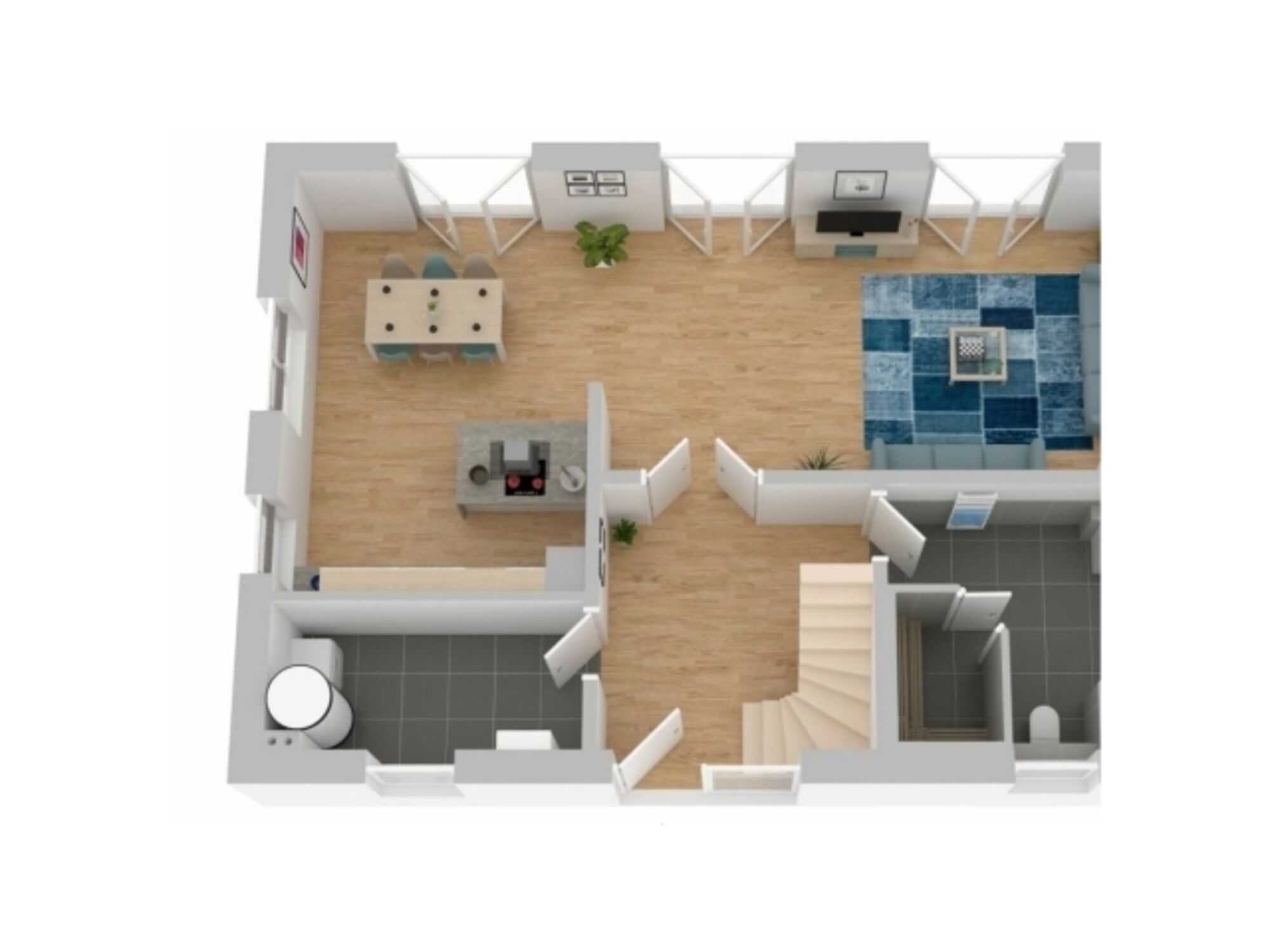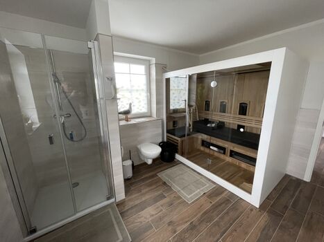 Von der Diele aus gelangen Sie in den großzügigen Wohn-und Essbereich mit Kaminofen und einer offenen Landhausküche, die Kochherzen höher schlagen lässt. Die Terrassentüren lassen viel Licht in die Räumlichkeiten und bieten einen tollen Ausblick in den großen Garten. Im Erdgeschoss befindet sich außerdem ein Wellnessbad mit Infrarotsauna. Waschmaschine sowie Wäschetrockner stehen kostenfrei im Hauswirtschaftsraum für Sie bereit.