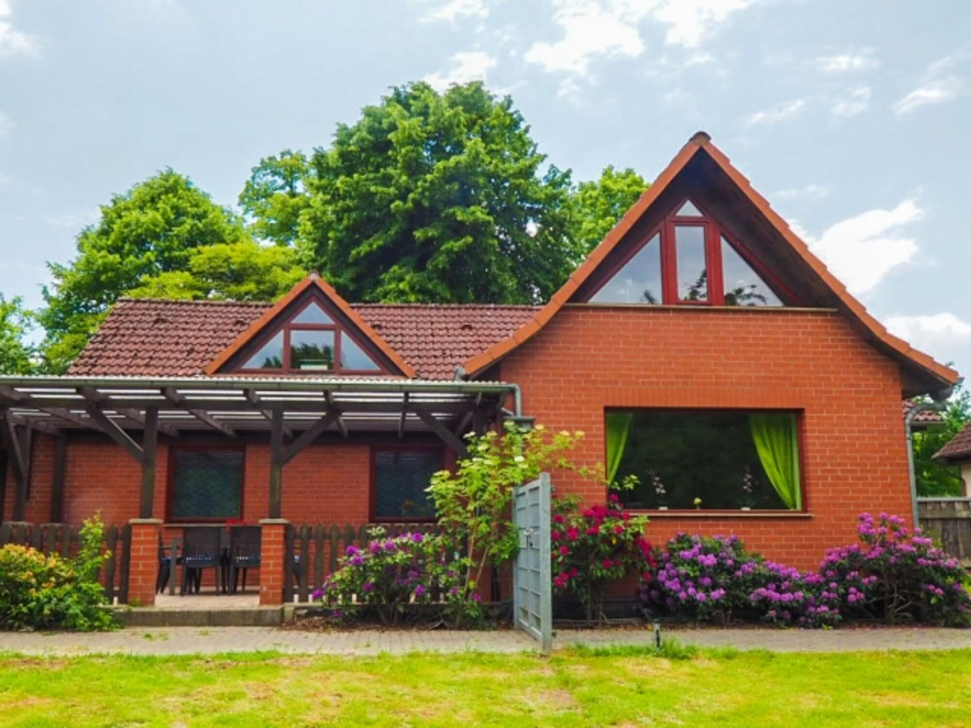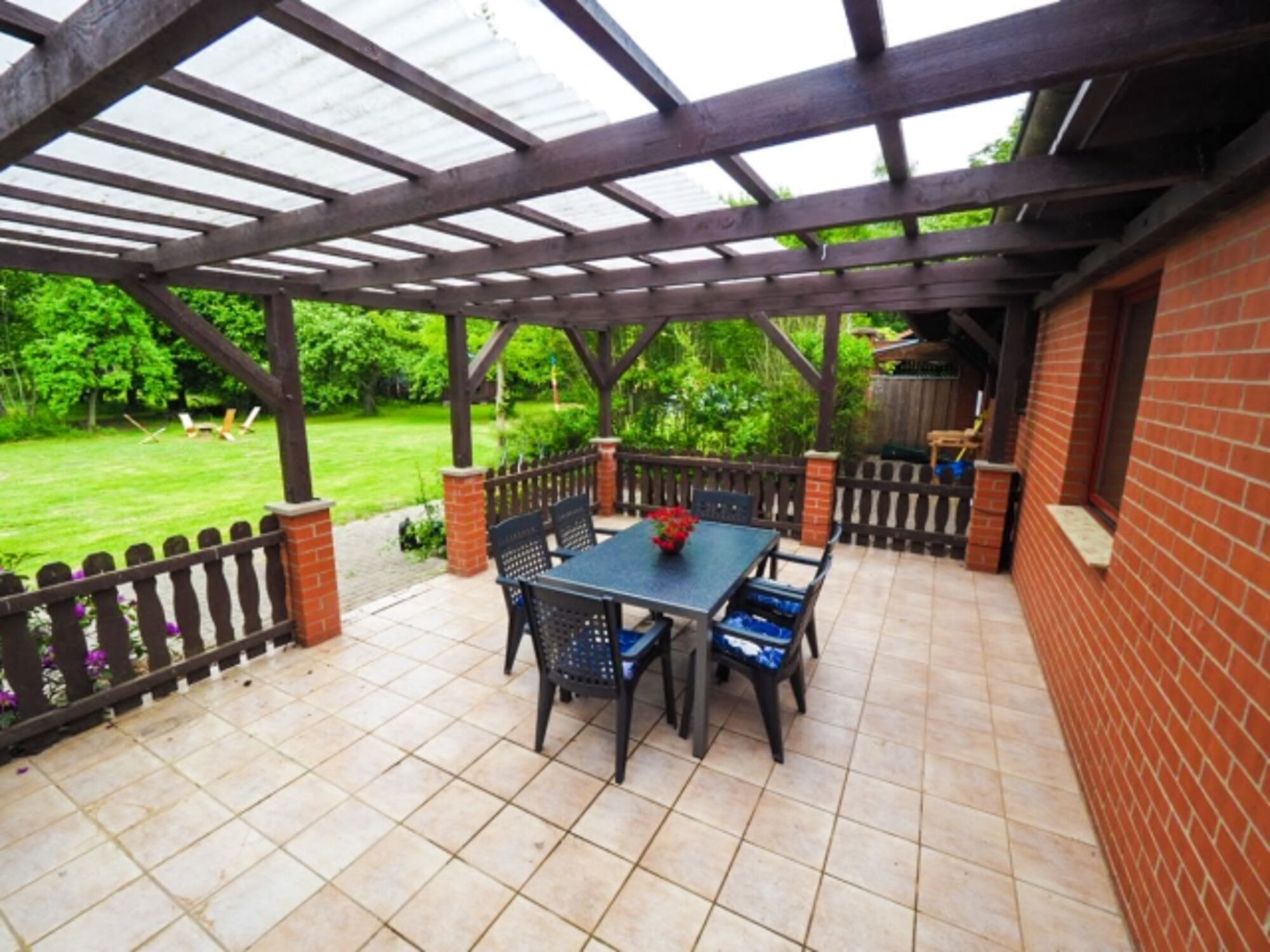 Das Ferienhaus verfügt über eine Terrasse mit Dach zum großen offenen Garten. Zur anderen Seite des Hauses befindet sich der eingezäunte Garten.