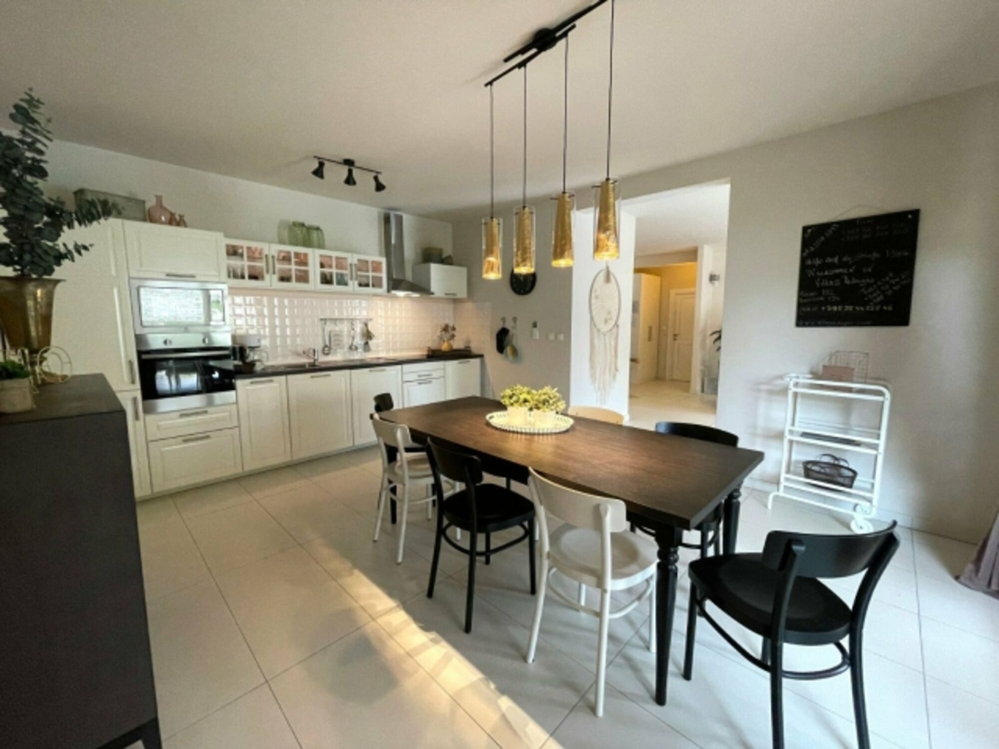 Cerankochfeld, Dunstabzugshaube, Kühlschrank mit Gefrierfach, Gefrierschrank, Nespresso-Automat, Korkenzieher / Flaschenöffner, Geschirrhandtücher, Essplatz in der Küche
