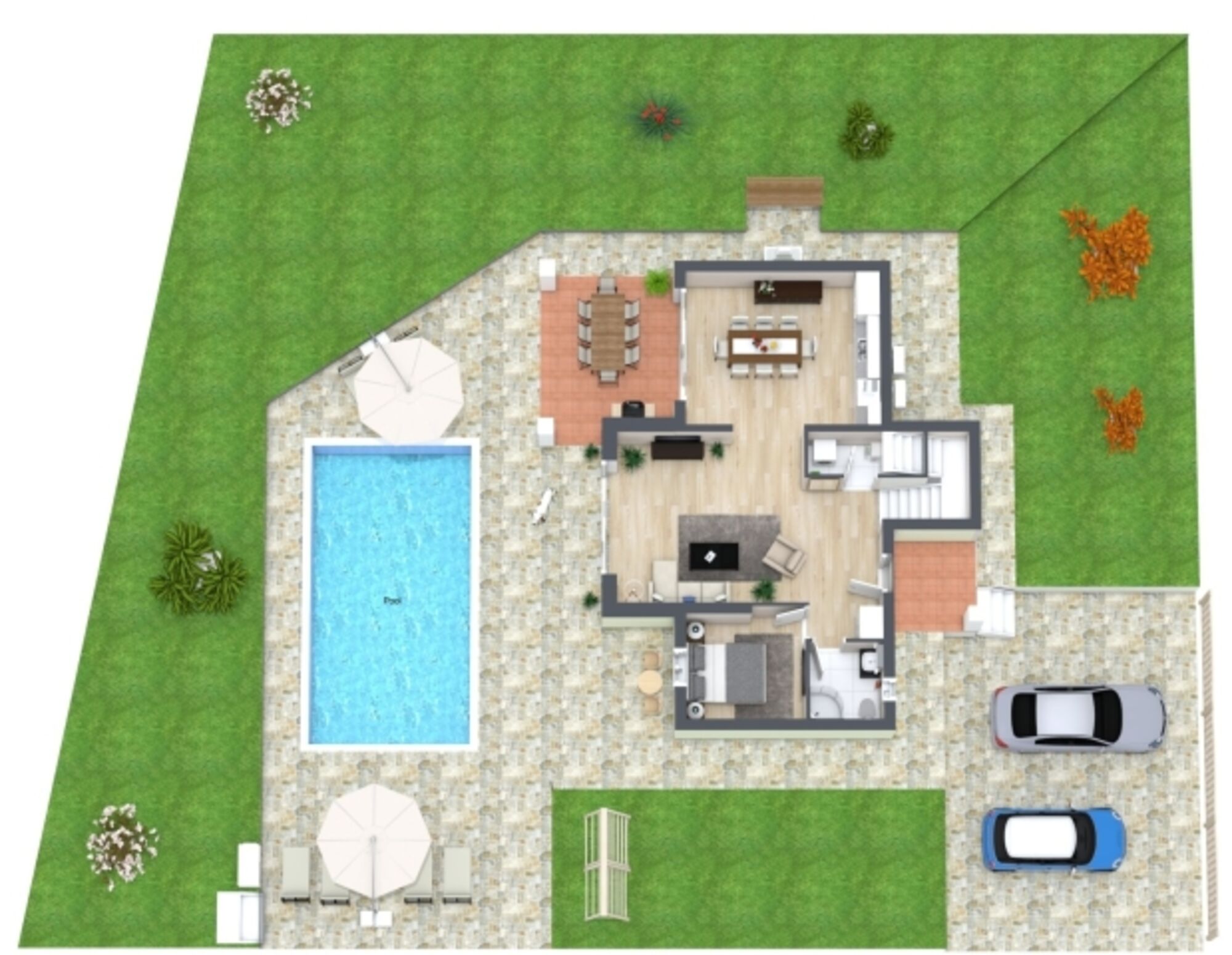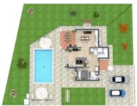 Vor der grünen Gartenkulisse tauchen Sie in den beheizbaren, mit blau/türkisen Mosaiksteinchen besetzten Pool (8x4m) ein, an dem die Sonnenliegen schon zum Relaxen einladen!