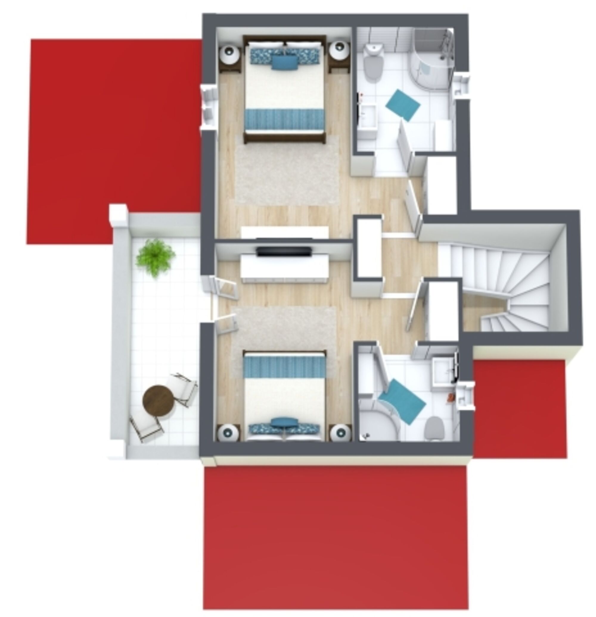 Im Erdgeschoss befindet sich barrierefrei das erste Schlafzimmer mit einem Doppelbett und angrenzendem Bad mit einer großen Dusche.