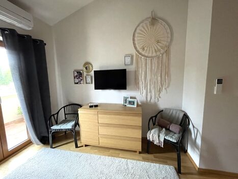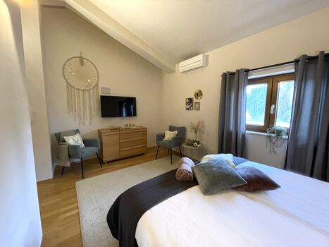 Die obere Etage beherbergt zwei weitere Schlafzimmer mit Doppelbetten und Bad en Suite. Eines sogar mit einem Balkon, von dem sich ein wunderbarer Blick auf die Umgebung, den Pool und die Gartenanlage bietet. Ein weiteres Plätzchen um die istrische Sonne zu genießen!