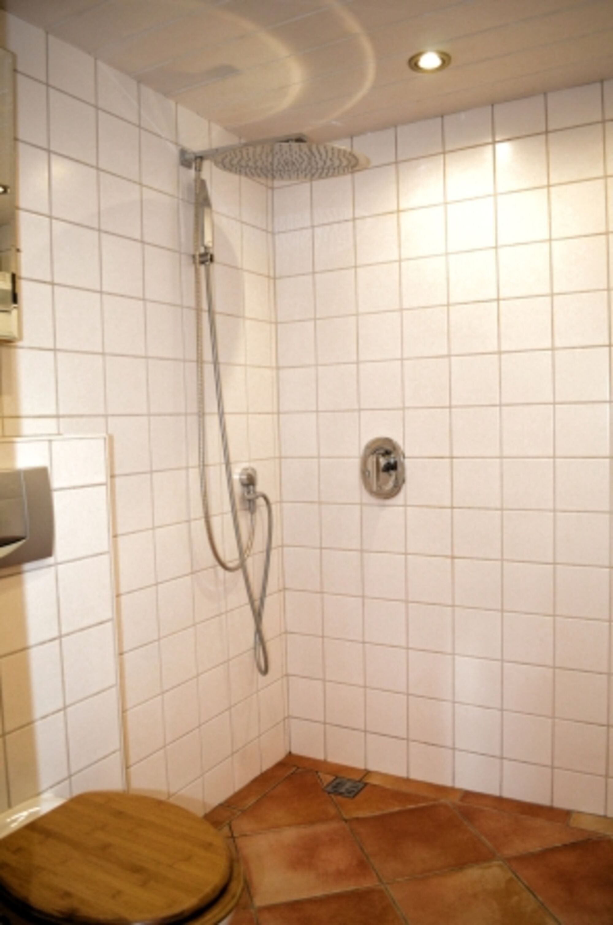 Zur Grundausstattung des Duschbads mit Regendusche gehört ein Gästehandtuch, ein Föhn, ein gefüllter Seifenspender, Zahnputzbecher aus Keramik und natürlich WC-Papier. Weitere Handtücher können hinzugebucht werden.