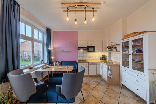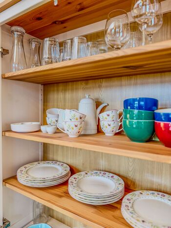 Cerankochfeld, Dunstabzugshaube, Kühlschrank mit Gefrierfach, Mixer, Korkenzieher / Flaschenöffner, Gewürze (Salz, Pfeffer, Zucker), Essplatz in der Küche, TV in der Küche
