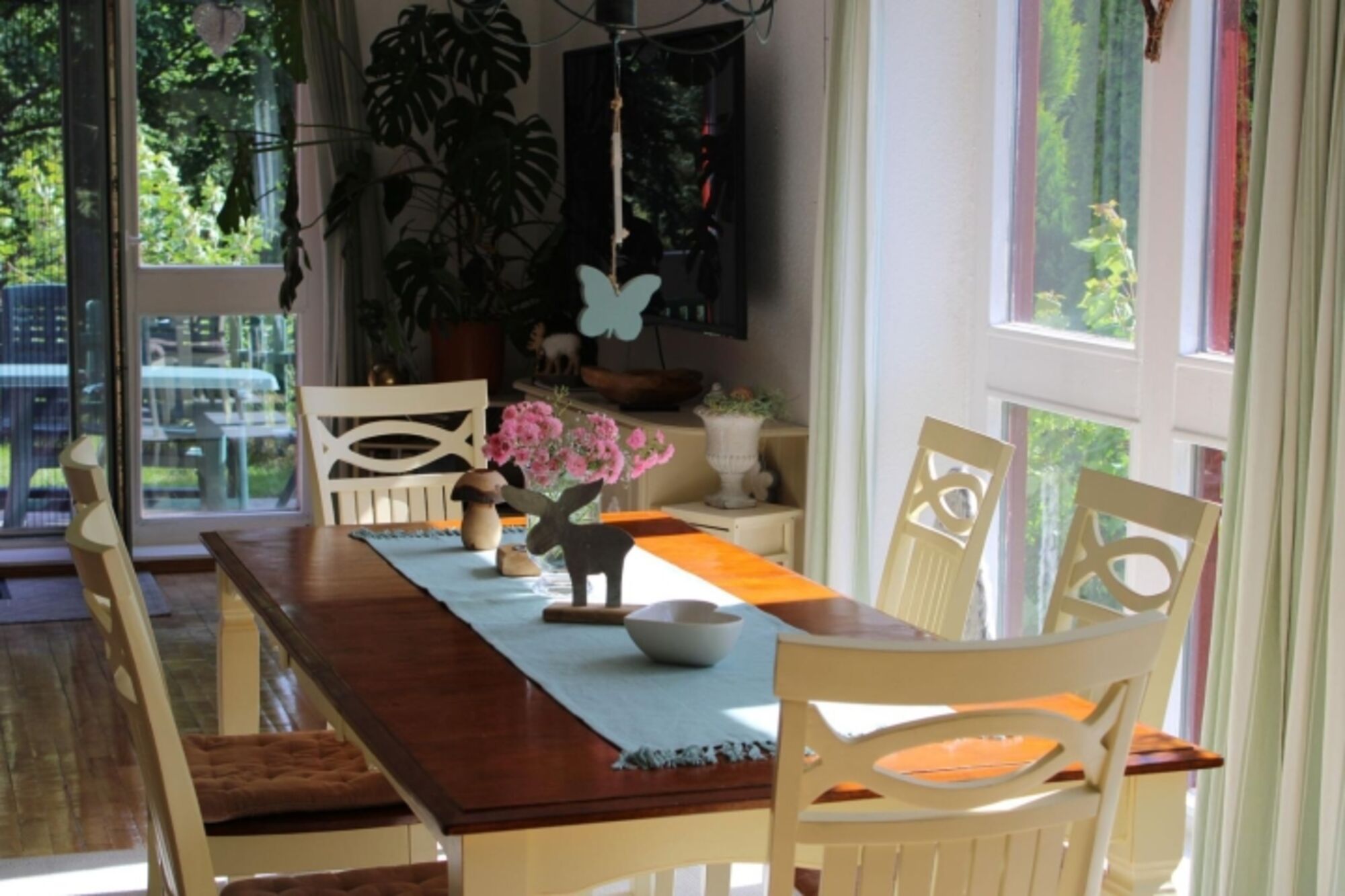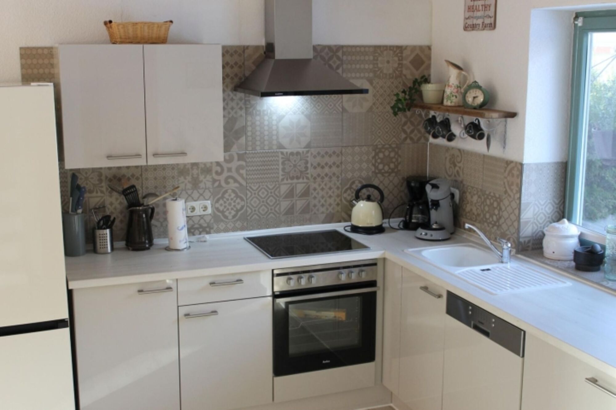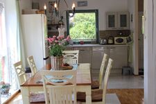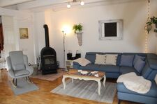 Die Einrichtung besticht durch ihren besonderen Charme im trendigen und modernen Stil. Die großen Holzbalken an der Decke sorgen für einen rustikalen Landhauslook. Im Wohnzimmer befindet sich ein 65 Zoll Fernseher mit Smart TV und 4 K. Die 3 Schlafzimmer bieten ausreichend Platz für 6-8 Personen und der knisternde Kaminofen im offenen Wohn-/Ess- und Kochbereich sorgt für eine gemütliche Atmosphäre. Außerdem befindet sich im Erdgeschoss noch ein Gäste-WC. Das sonnendurchflutete und helle Ferienhaus ist voll ausgestattet und wird regelmäßig modernisiert. Unsere Küche ist perfekt für Sie eingerichtet. Sie finden unter anderem eine Kaffeemaschine, Senseo Padmaschine, Mikrowelle, Wasserkocher, Herd, Backofen, Eierkocher, Geschirrspüler, Kühlschrank und Minigefrierschrank und ein umfangreiches Sortiment an Geschirr und Gläsern.
