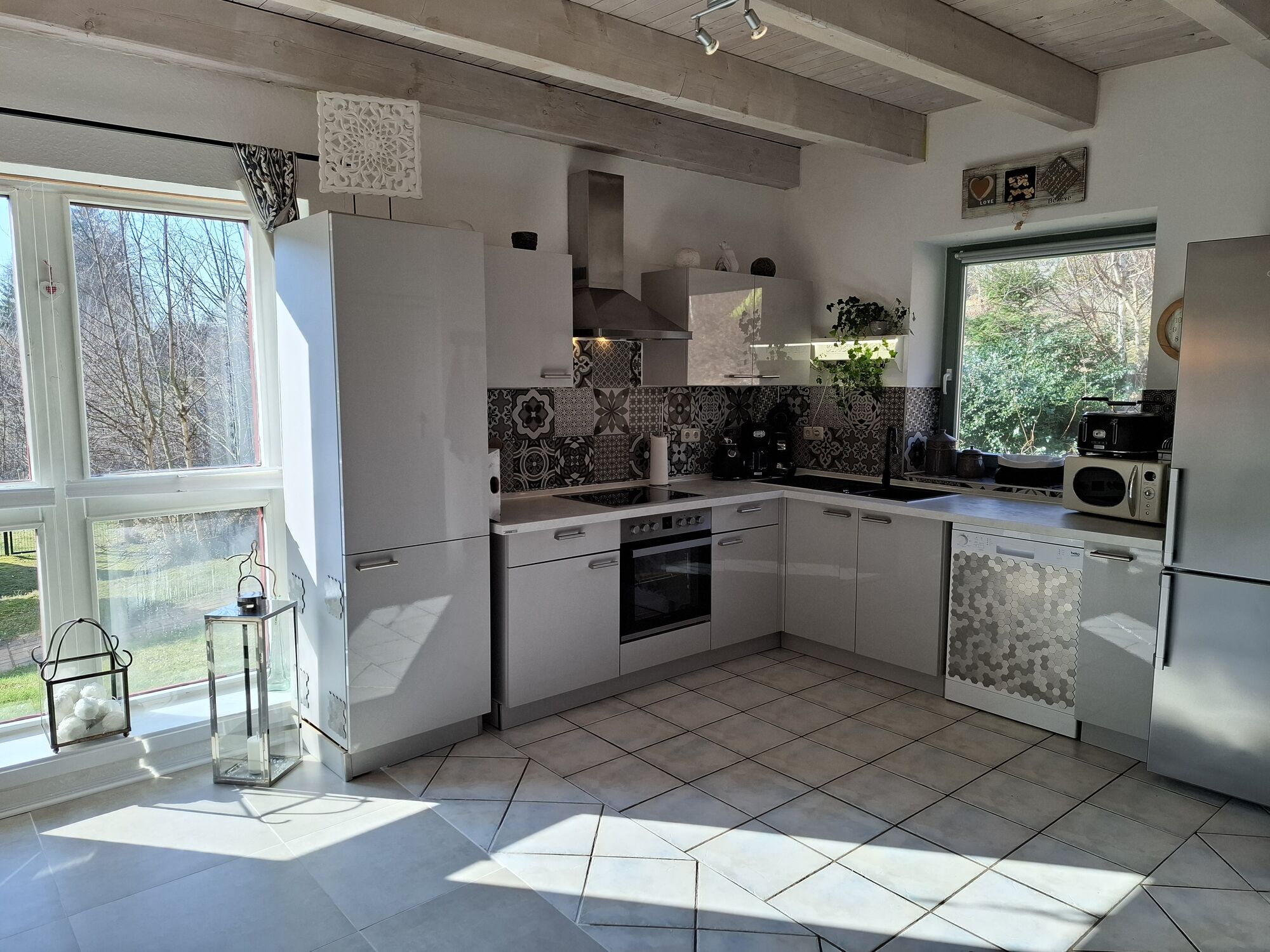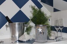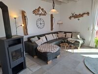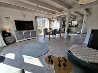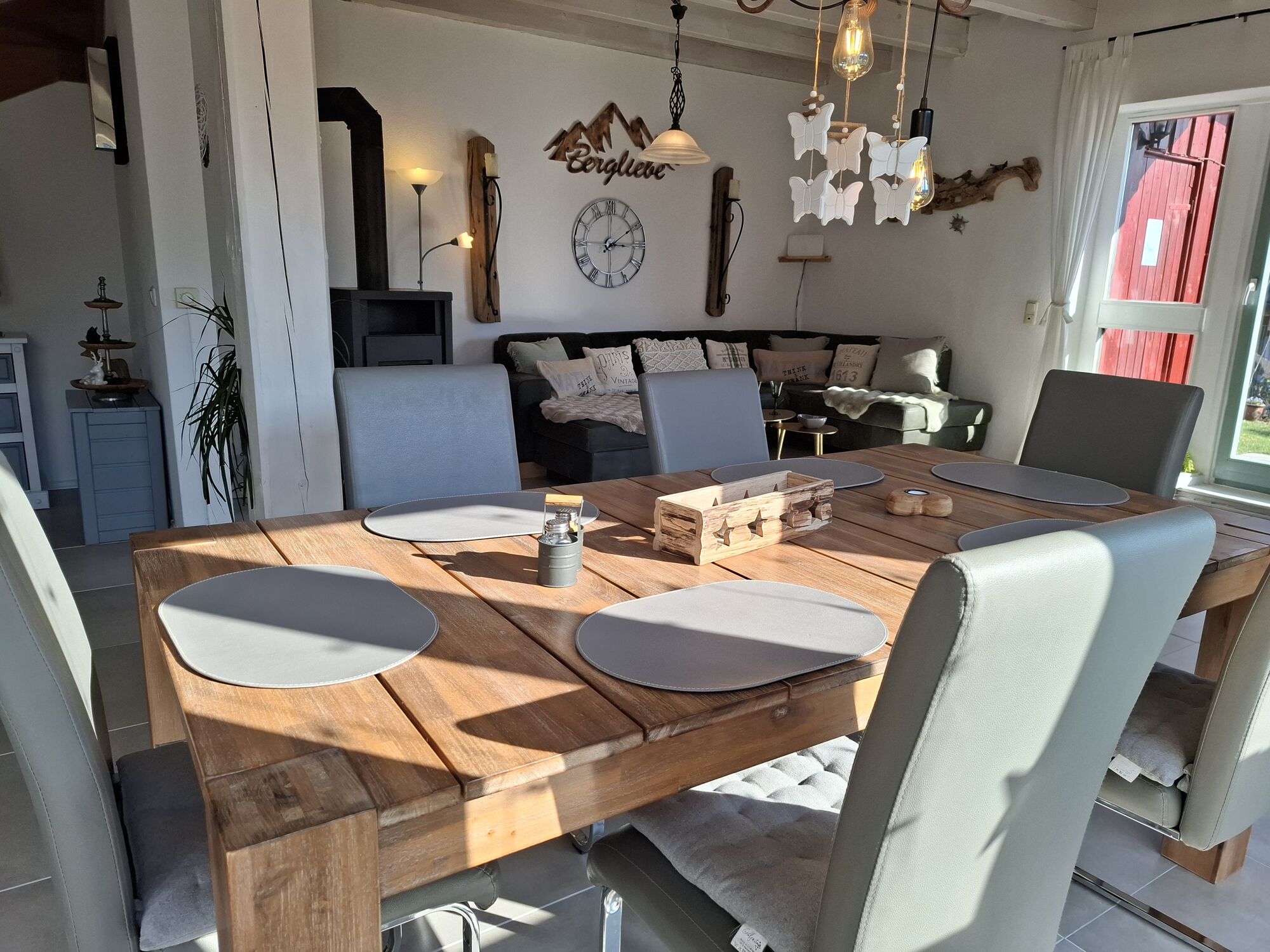 Die Einrichtung besticht durch ihren besonderen Charme im trendigen und modernen Stil. Die großen Holzbalken an der Decke sorgen für einen rustikalen Landhauslook. Im Wohnzimmer befindet sich ein 65 Zoll Fernseher mit Smart TV und 4 K. Die 3 Schlafzimmer bieten ausreichend Platz für 6-8 Personen und der knisternde Kaminofen im offenen Wohn-/Ess- und Kochbereich sorgt für eine gemütliche Atmosphäre. Außerdem befindet sich im Erdgeschoss noch ein Gäste-WC. Das sonnendurchflutete und helle Ferienhaus ist voll ausgestattet und wird regelmäßig modernisiert. Unsere Küche ist perfekt für Sie eingerichtet. Sie finden unter anderem eine Kaffeemaschine, Senseo Padmaschine, Mikrowelle, Wasserkocher, Herd, Backofen, Eierkocher, Geschirrspüler, Kühlschrank und Minigefrierschrank und ein umfangreiches Sortiment an Geschirr und Gläsern.