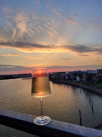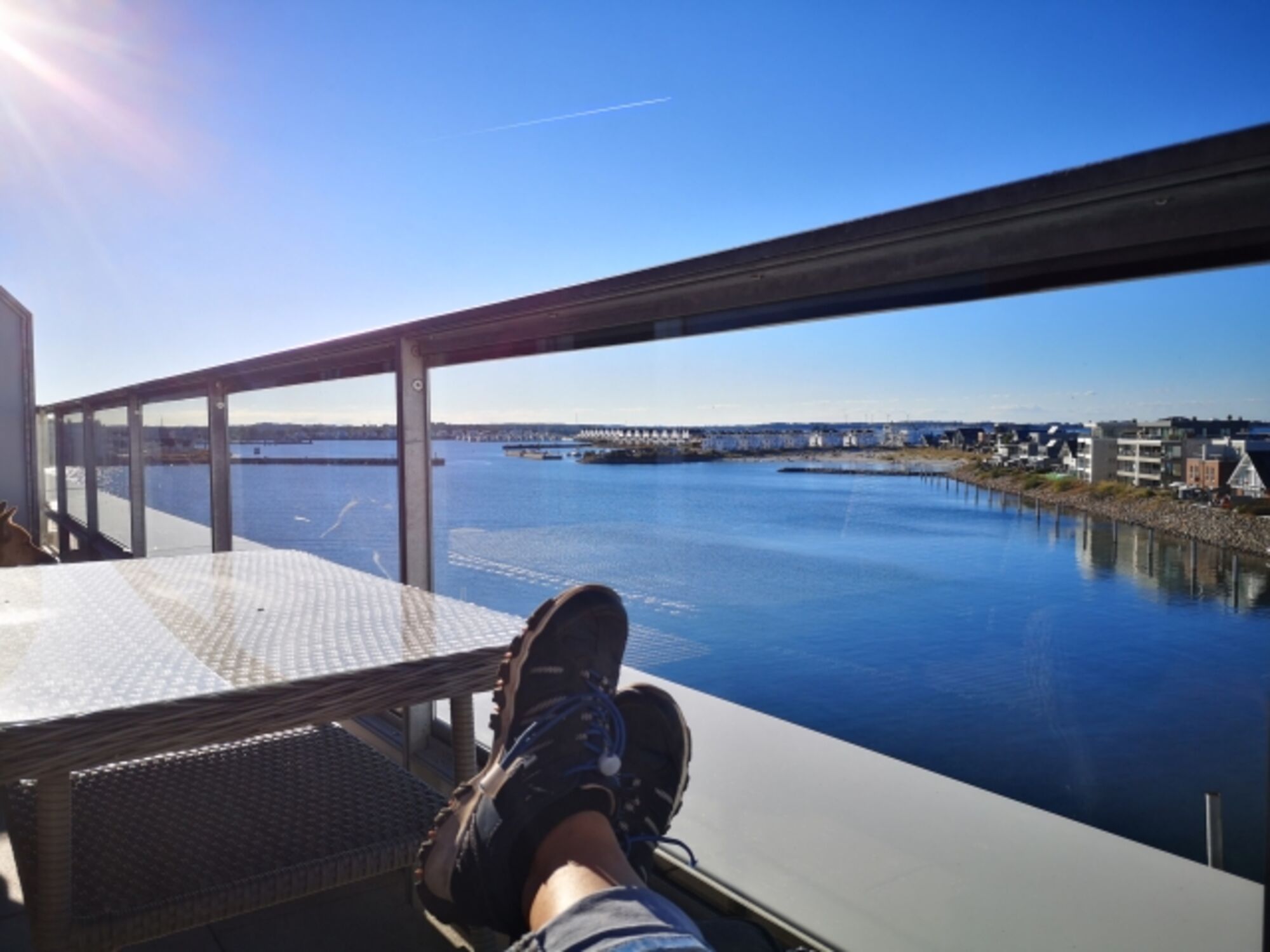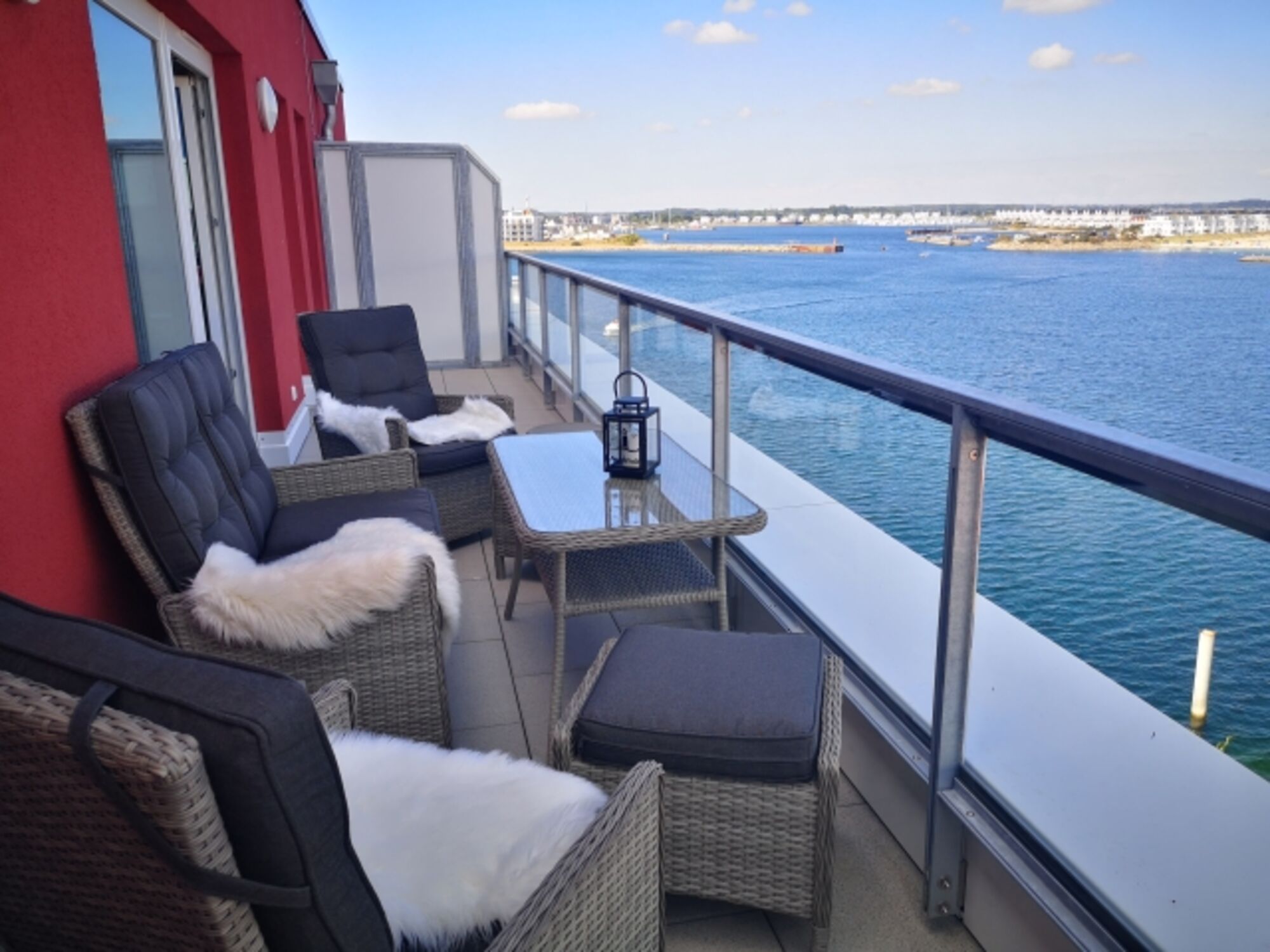 Die Terrasse ist mit Lounge-Möbeln ausgestattet. Hier könnt ihr den Sonnenuntergang genießen, mit unverbautem Blick auf den Hafen, den kleinen Strand, die Ostsee und die Schleimünde mit seinem schönen Leuchtturm.