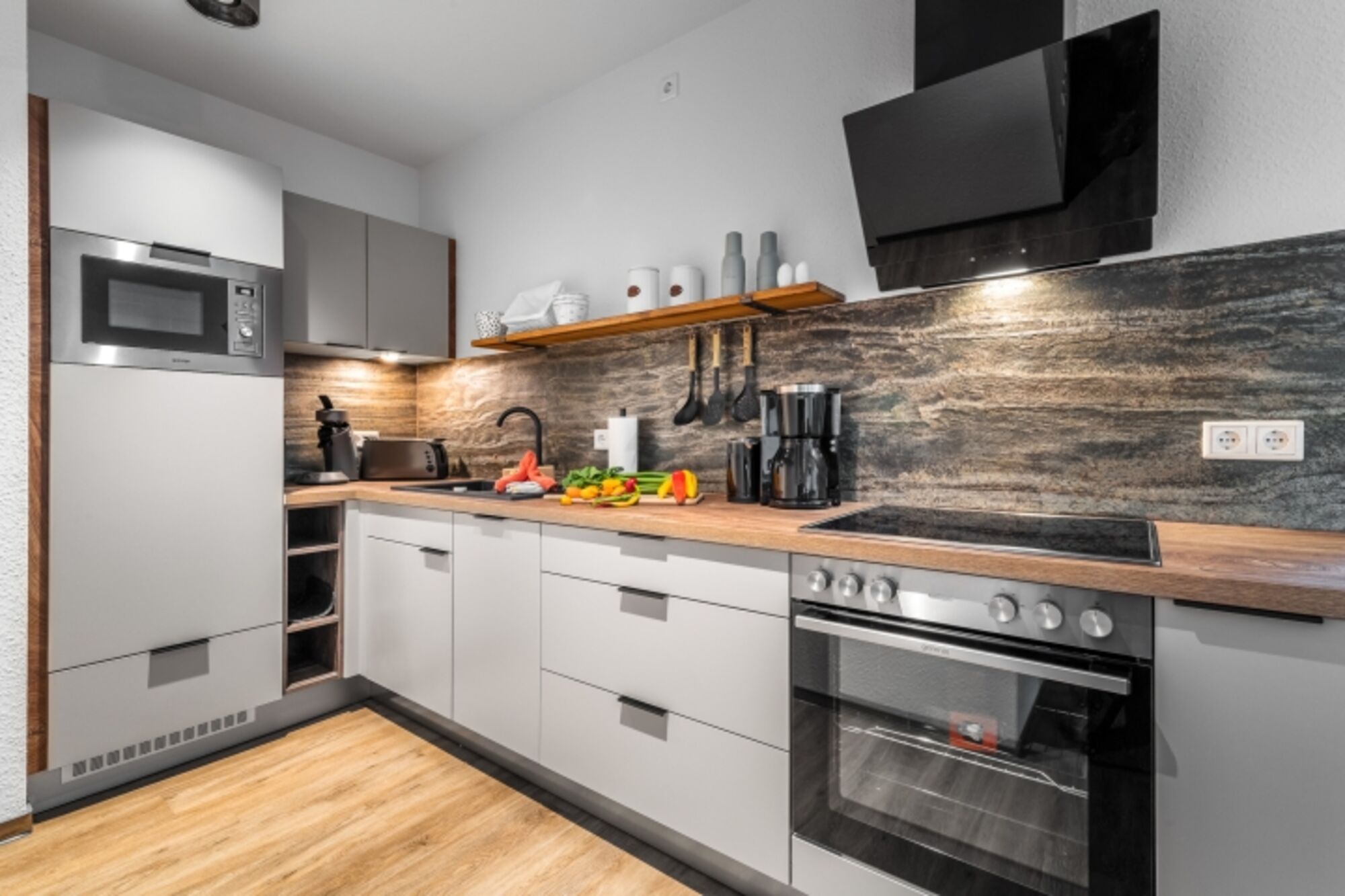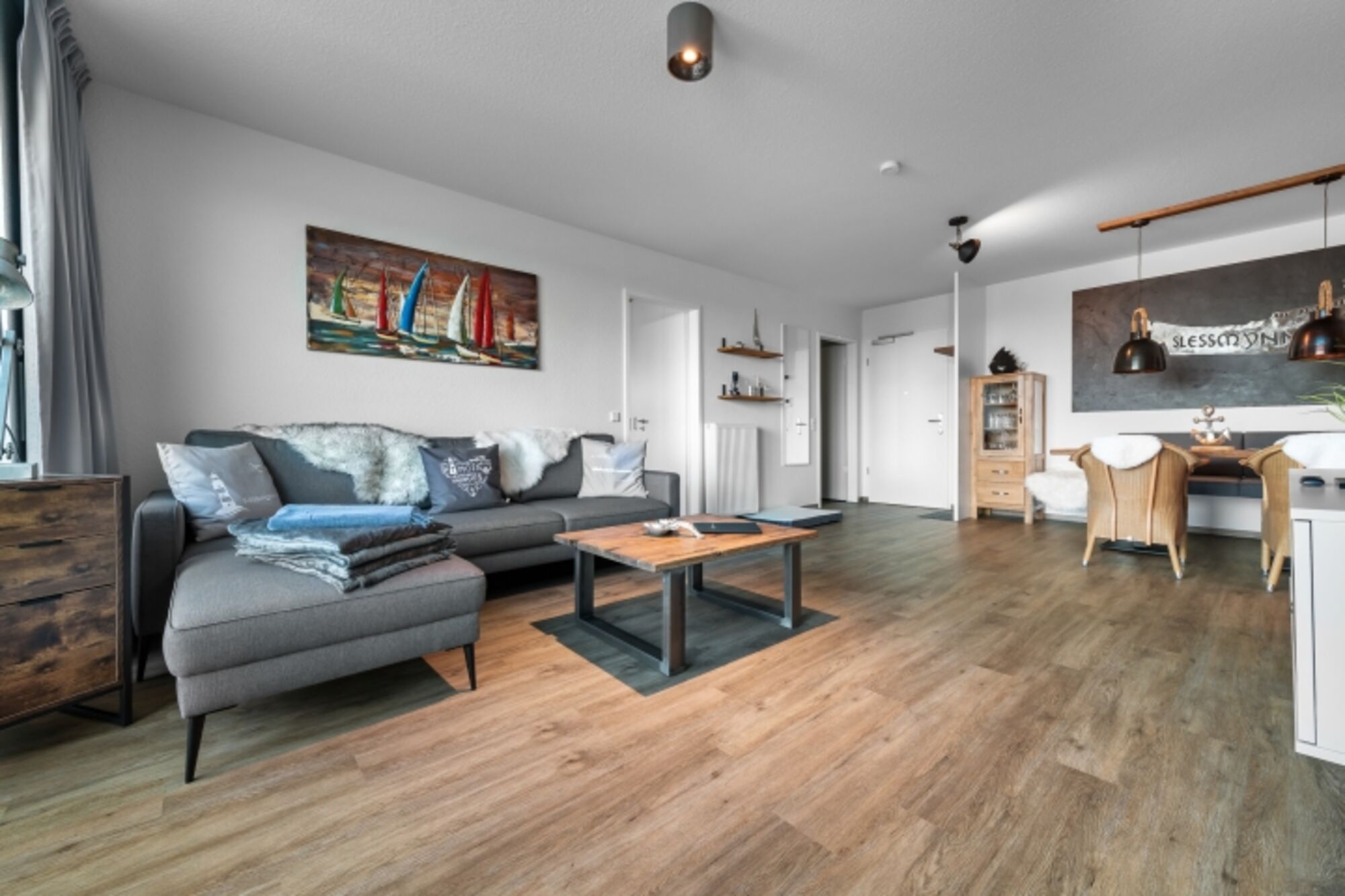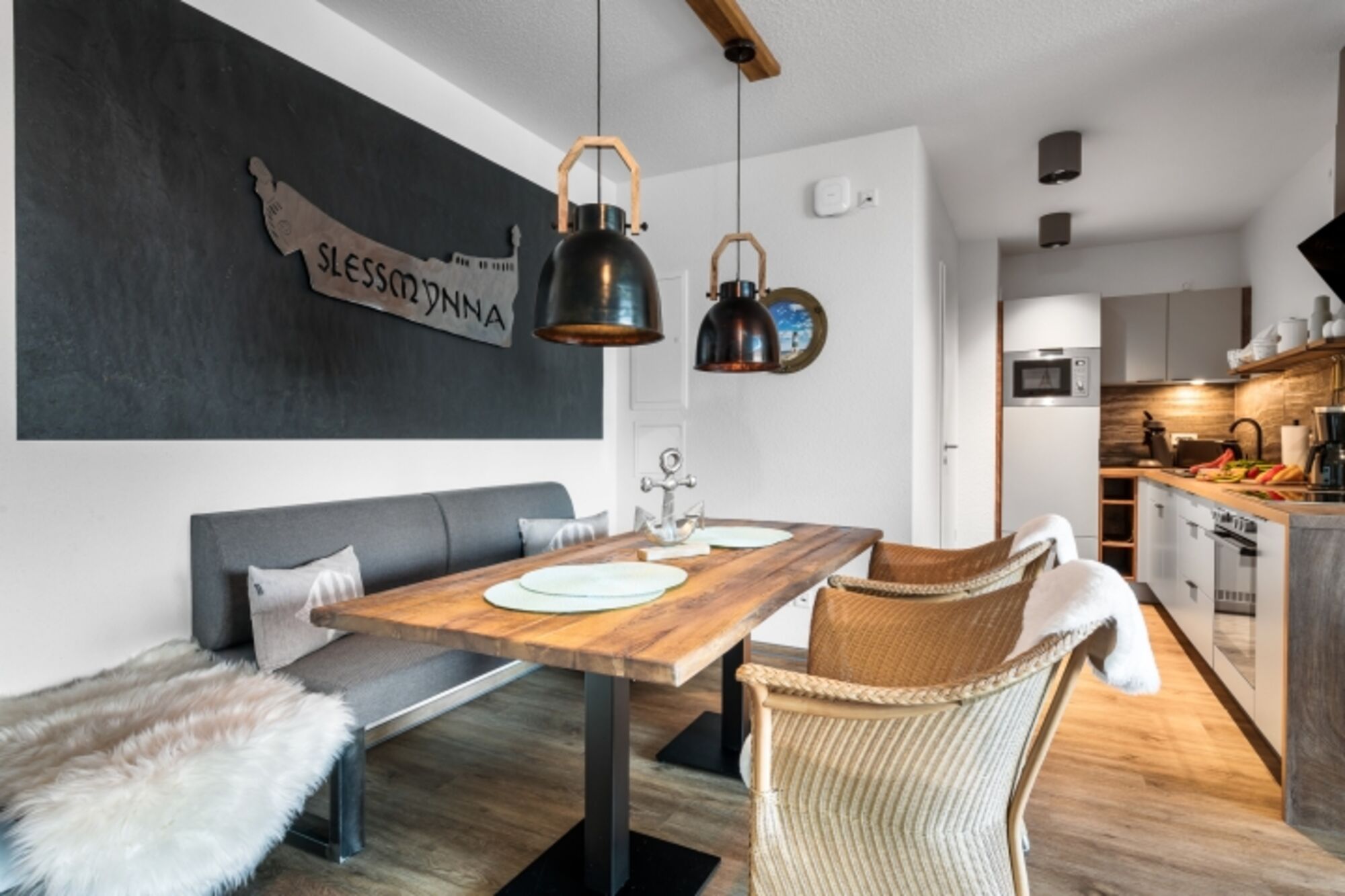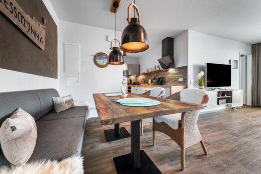 Die Wohnung ist liebevoll und hochwertig eingerichtet, zum Teil mit handgefertigten Möbeln aus eigener Herstellung.