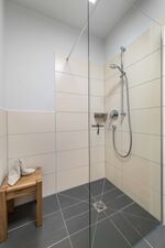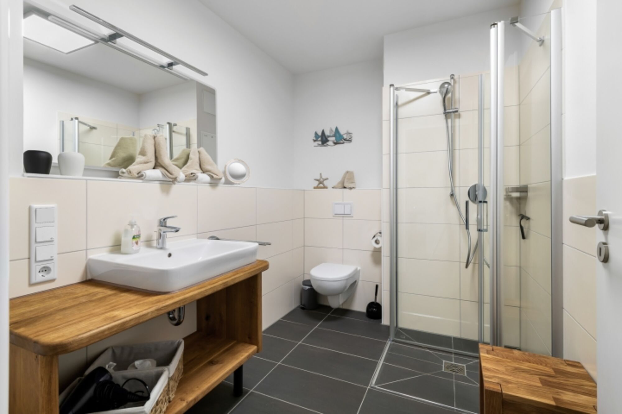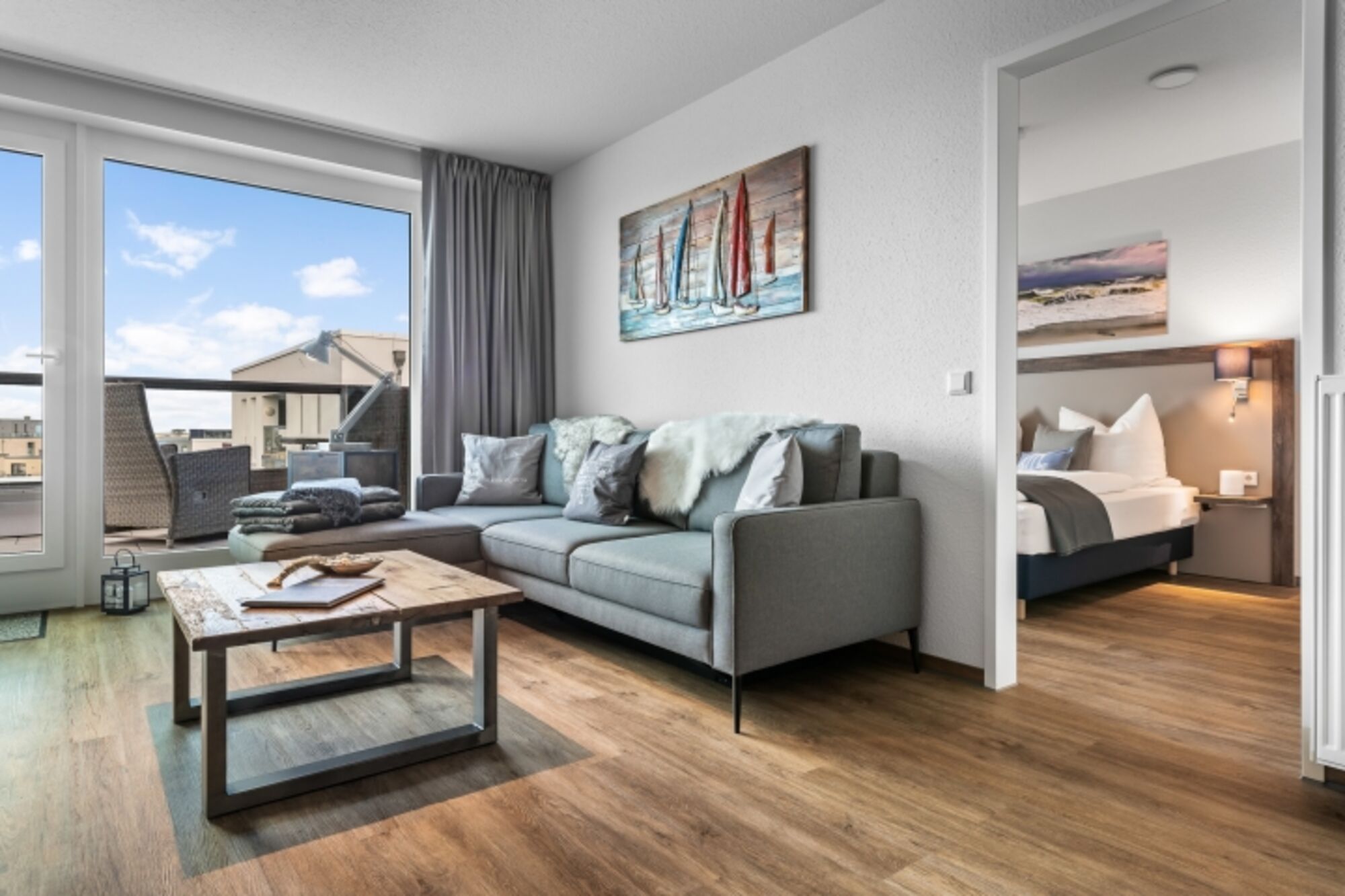 Bis 6 Personen, 2 Schlafzimmer mit Boxspringbetten und direktem Zugang zur Terrasse, 2 Bäder mit begehbaren Duschen und beleuchteten Spiegeln, Wohnzimmer mit Schlafcouch (160x200cm), offene Küche und separatem Essbereich.