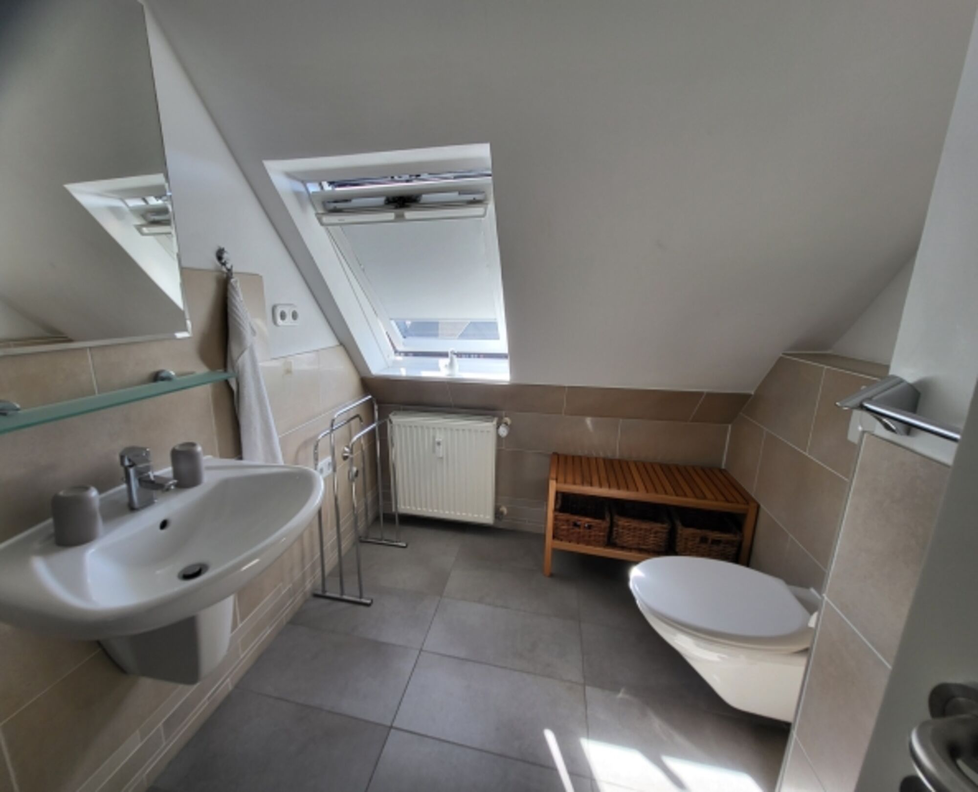 Waschbecken, Regendusche, Spiegel, Fenster im Bad
