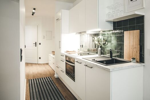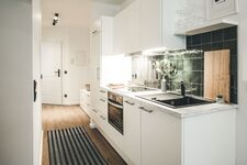 4-Platten Herd, Cerankochfeld, Dunstabzugshaube, Kühlschrank mit Gefrierfach, Nespresso-Automat, Korkenzieher / Flaschenöffner, Geschirrhandtücher, Mülltüten, Essplatz in der Küche