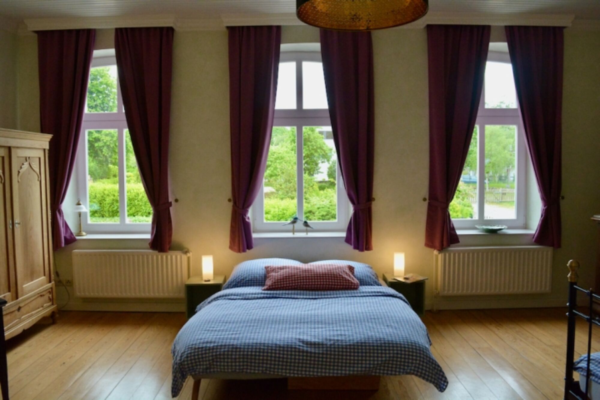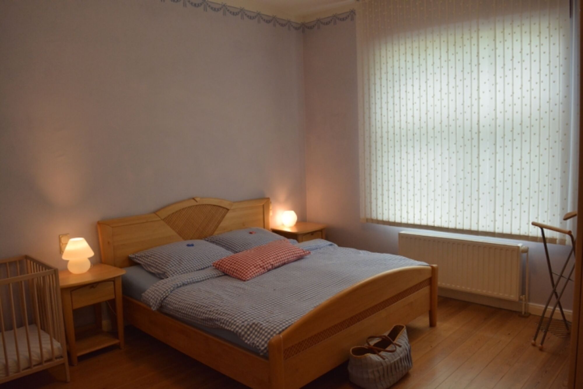 Doppelbett 1,60 x 2,00m, Einzelbett, Kommode, Leselampe am Bett, Fliegengitter