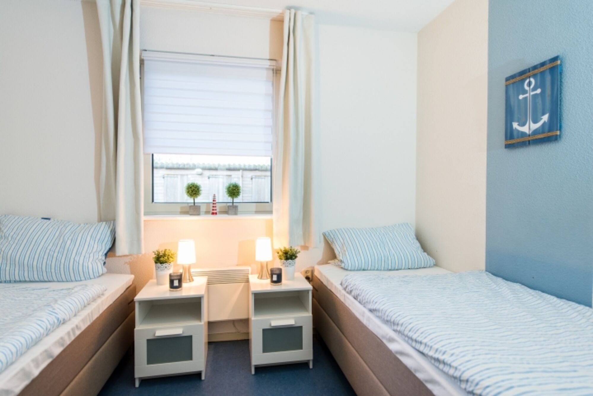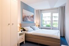 Die Wohnung verfügt über 2 Schlafzimmer. Die Verdunklungsgardinen in beiden Räumen sorgen dafür, dass es auf Wunsch komplett abgedunkelt ist. Im 1. Schlafzimmer finden Sie ein Doppelbett mit den Maßen 1,80 x 2,00 m vor. hier haben Sie direkten Zugang zur Terasse. Das 2. Schlafzimmer verfügt über zwei einzelne Betten, 90 x 2,00 m.